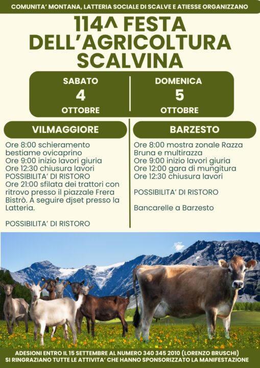 L’edizione 2025 della Fiera del Bestiame e dell’Agricoltura Scalvina si terrà sabato 4 e domenica 5 ottobre nei campi di fronte alla Latteria Sociale di Scalve.