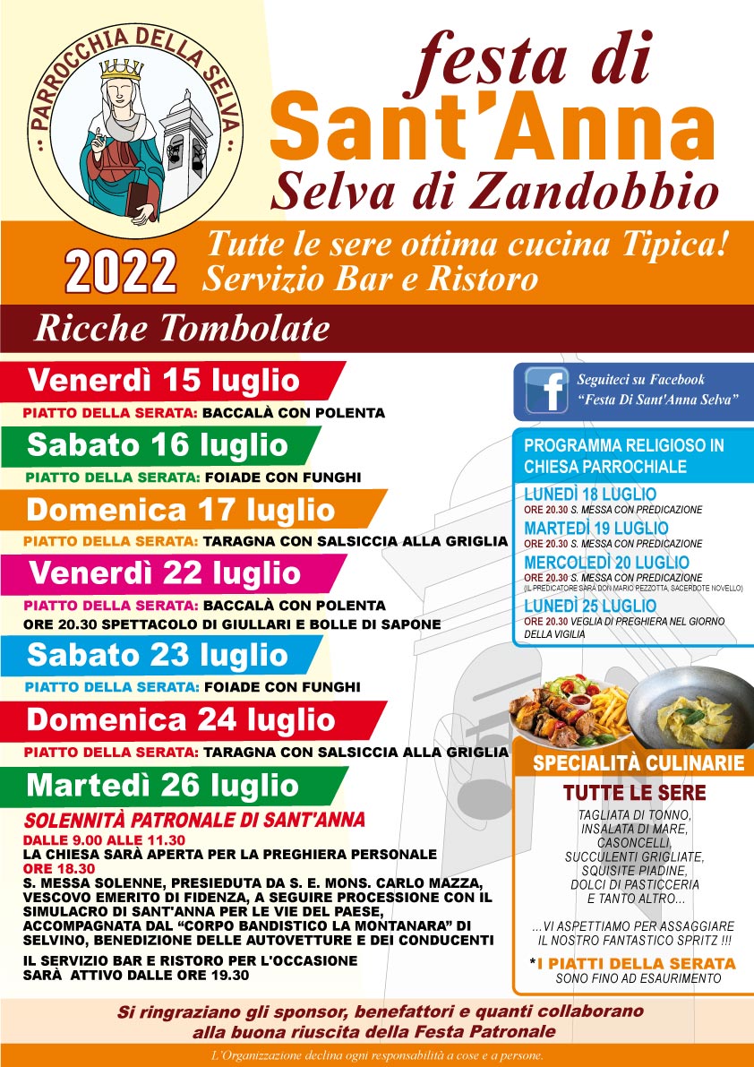 Torna dal 15 al 26 Luglio la Festa Patronale di S. Anna alla Selva di Zandobbio; tutte le sere vi aspetta un'ottima cucina tipica con il servizio bar e ristoro!