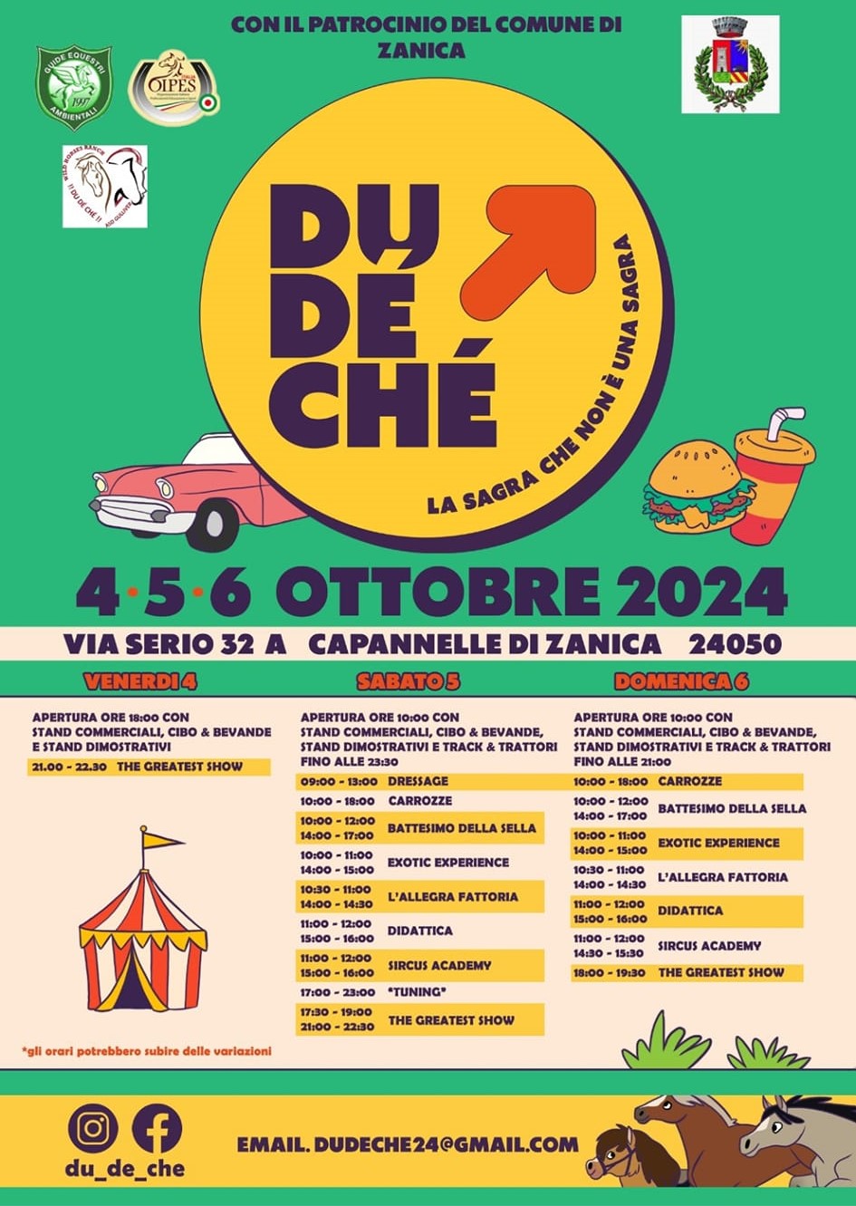 Dal 4 al 6 ottobre, a Capannelle di Zanica, si terrà Du dé Che, un evento unico nel suo genere. Tre giorni dedicati al divertimento, alla scoperta del territorio e al gusto. L'iniziativa, patrocinata dal Comune di Zanica, prevede un ricco programma di attività per tutte le età, tra cui stand gastronomici, dimostrazioni, spettacoli e laboratori per bambini. Saranno presenti: