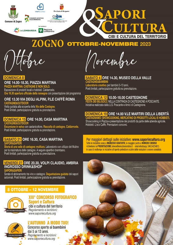 La quindicesima edizione della rassegna culturale- gastronomica Sapori&Cultura promossa dal Comune di Zogno Assessorato al Turismo è ormai alle porte. Si inizia domenica 8 ottobre e si terminerà domenica 19 novembre. La rassegna prevede un fitto calendario di incontri: esposizione di prodotti tipici con caldarroste, escursioni guidate, abbinamento di vino e castagne, raccolta in selva, piatti a tema, laboratori e attività per i più piccoli, showcooking.