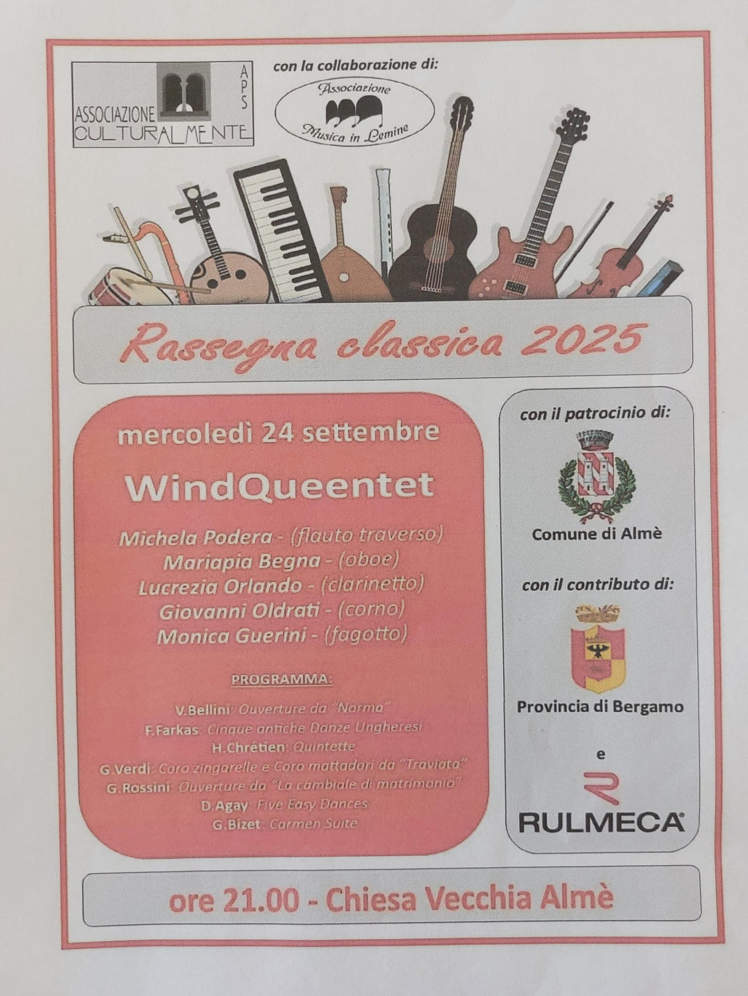 La Rassegna Classica 2025, organizzata dall'Associazione Culturalmente -APS, in collaborazione con l'Associazione Musica in Lemine di Almรจ, propone un concerto del WindQueentet, formato per l'occasione da Michela Podera (flauto), Maria Begna (oboe), Lucrezia Orlando (clarinetto), Giovanni Oldrati (corno) e Monica Guerini (fagotto).