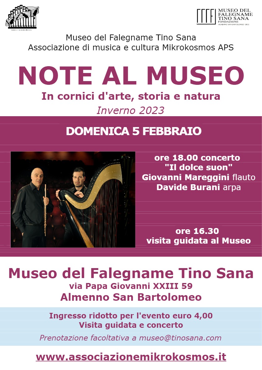 Giovanni Mareggini al flauto e Davide Burani all’arpa condurranno il concerto “Il dolce suon” incantando il pubblico tra le più note composizioni a cavallo di quattro secoli (1685-1944) di Johann Sebastian Bach, Gioacchino Rossini, Clemence de Grandval, Johannes Donjon, Giovanni Caramiello, Stanislao Gastaldon, Luigi Maurizio Tedeschi e Francois Borne. Con un ritmo incalzante gli spettatori godranno della musica classica in un contesto che unisce la storia, la tradizione e il racconto del legno e della sua lavorazione.