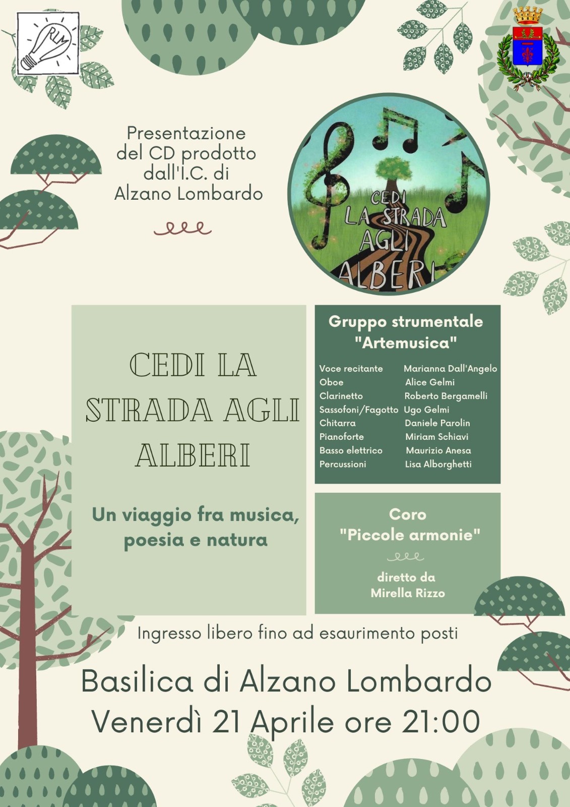L’Istituto Comprensivo «Rita Levi Montalcini» di Alzano Lombardo è lieto di invitarvi a al concerto «Cedi la strada agli alberi», che si terrà nella Basilica «San Martino» di Alzano Maggiore. Saranno eseguite dall’ensemble «Artemusica» le musiche composte e dirette dal Prof. Ugo Gelmi. Al termine del concerto verrà presentato il CD auto prodotto dall’Istituto Comprensivo. All’evento partecipa il coro «Piccole Armonie», composto da allievi della scuola primaria e diretto dalla Prof.ssa Mirella Rizzo.