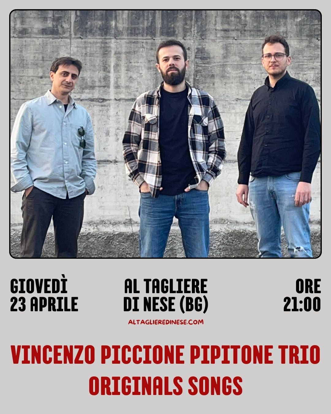 Al Tagliere di Nese, รจ un programma una serata con il Vincenzo Piccione Pipitone Trio. Un viaggio musicale tra la canzone d'autore e la sperimentazione contemporanea.