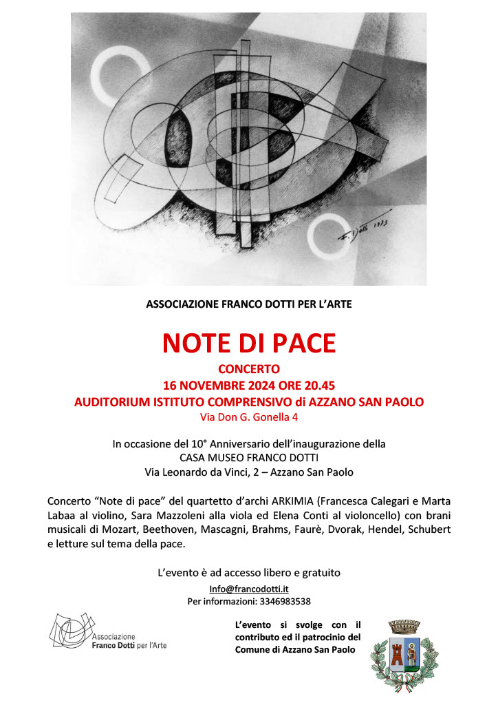 Sabato 16 novembre 2024, alle 20.45, presso l'Auditorium dell'Istituto Comprensivo di Azzano San Paolo, si terrà il concerto "Note di Pace" del Quartetto d'Archi Arkimia, arricchito da letture sul tema della pace. L'evento rappresenta un'importante occasione per celebrare il decimo anniversario della Casa Museo Franco Dotti, un luogo dedicato alla memoria dell'artista e al suo impegno per la promozione della cultura e dell'arte. La serata sarà all'insegna della musica e della riflessione, con l'esecuzione di brani di grandi compositori come Mozart, Beethoven, Mascagni, Brahms, Fauré, Dvorak, Händel e Schubert, che accompagneranno letture ispirate al tema universale della pace.