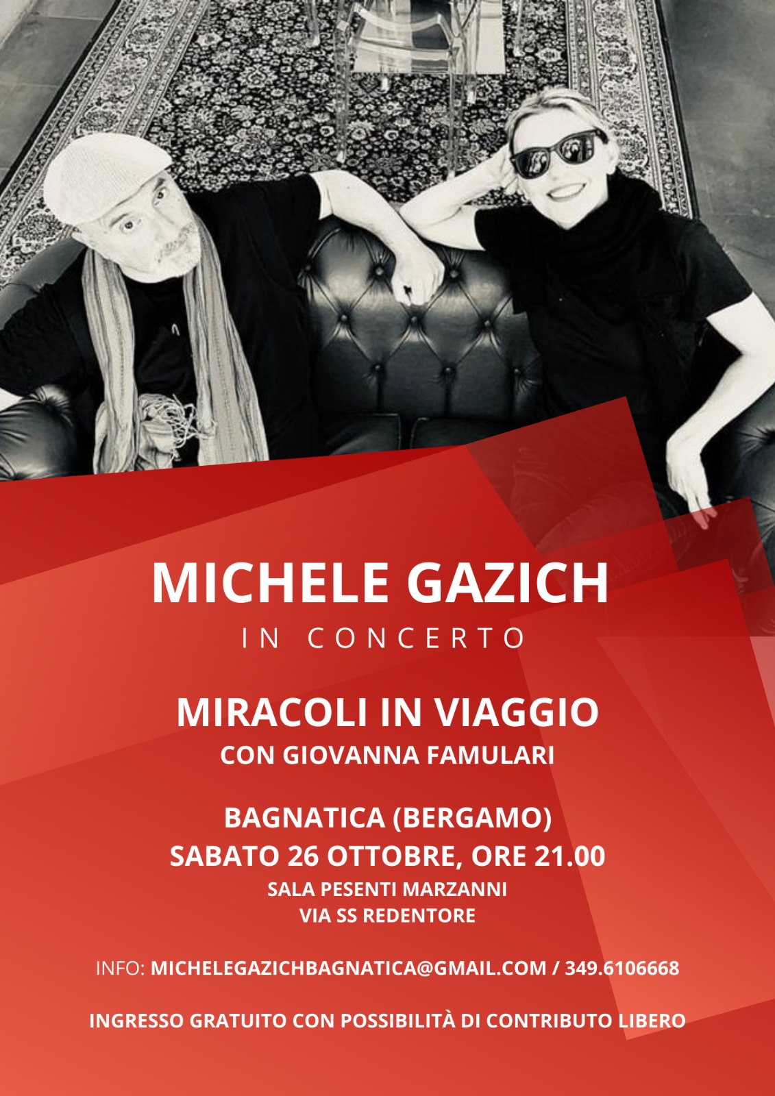 Michele Gazich, cantautore e musicista italiano, porterà il suo concerto “Miracoli in viaggio”, accompagnato da Giovanna Famulari. Quello di Bagnatica è uno degli approdi di un giro di concerti che anticipano dal vivo alcune delle canzoni del disco “Solo i miracoli hanno un senso stanotte in questa trincea”, in uscita il prossimo febbraio.
