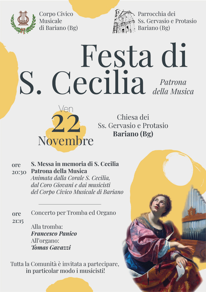 In occasione della ricorrenza di S. Cecilia, il Corpo Civico Musicale di Bariano in collaborazione con la Parrocchia di Bariano organizza per venerdì 22 novembre una piccola manifestazione in onore della Patrona della musica e di tutti i musicisti.