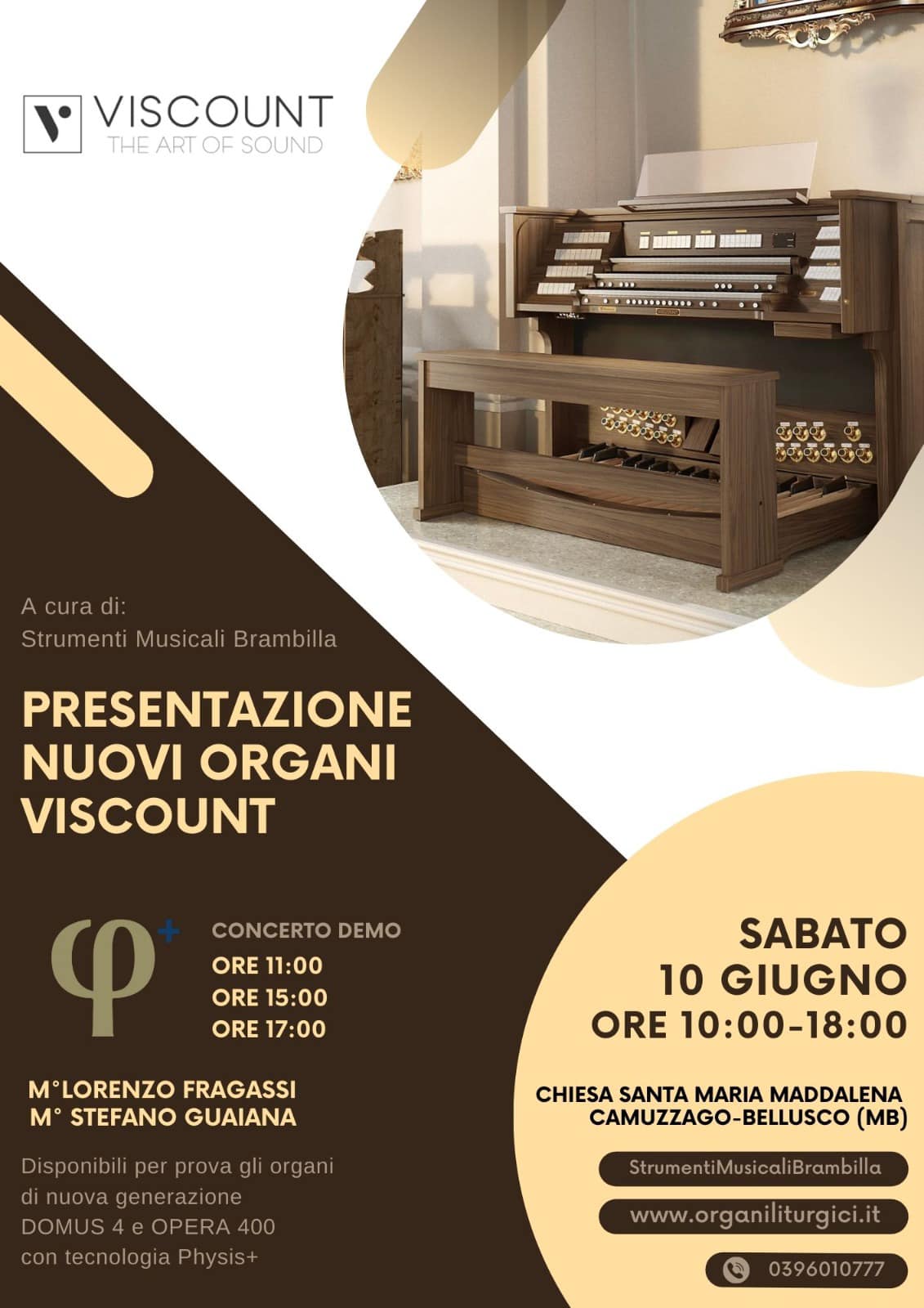 Strumenti Musicali Brambilla, in collaborazione con Viscount, organizza nella chiesa millenaria di Santa Maria Maddalena, sita in Camuzzago-Bellusco, una presentazione di organi elettronici liturgici con tre momenti di dimostrazione-concerto alle 11, 15 e 17 tenuti dai maestri Lorenzo Fragassi e Stefano Guaiana.