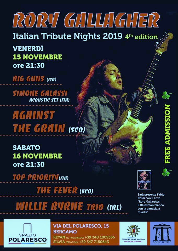 Venerdì 15 e sabato 16 novembre allo Spazio Polaresco di Bergamo si svolgerà la 4^ edizione del tributo italiano alla leggenda Irlandese, il chitarrista Rory Gallagher. Ingresso gratuito.
