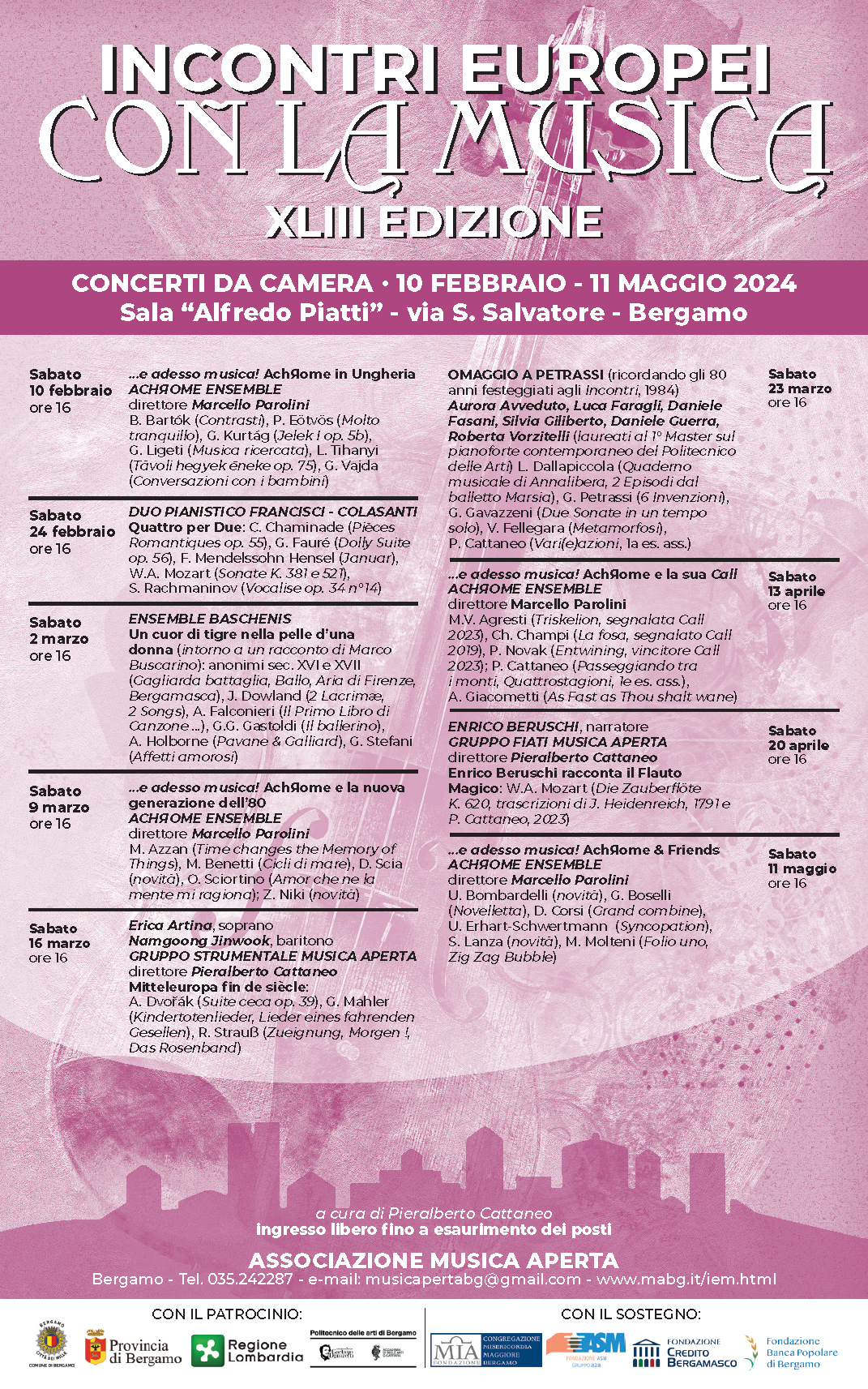 Nel 2024, con il progetto "...e adesso musica! - Stagione di musica contemporanea a Bergamo", Achrome Ensemble giunge al suo ottavo anno di attività, testimoniando il grande impegno e la fiducia dimostrati dai suoi membri nei primi anni di presenza sul territorio bergamasco.