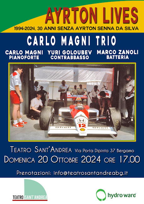Hydro Ware sostiene ancora una volta la musica e promuove un concerto a Bergamo. Il 20 ottobre alle 17 al Teatro Sant’Andrea di via Porta Dipinta 17 è in programma “Ayrton Lives” con il Carlo Magni Trio. Un concerto di musica jazz per celebrare i 30 anni dalla morte del grande pilota brasiliano.