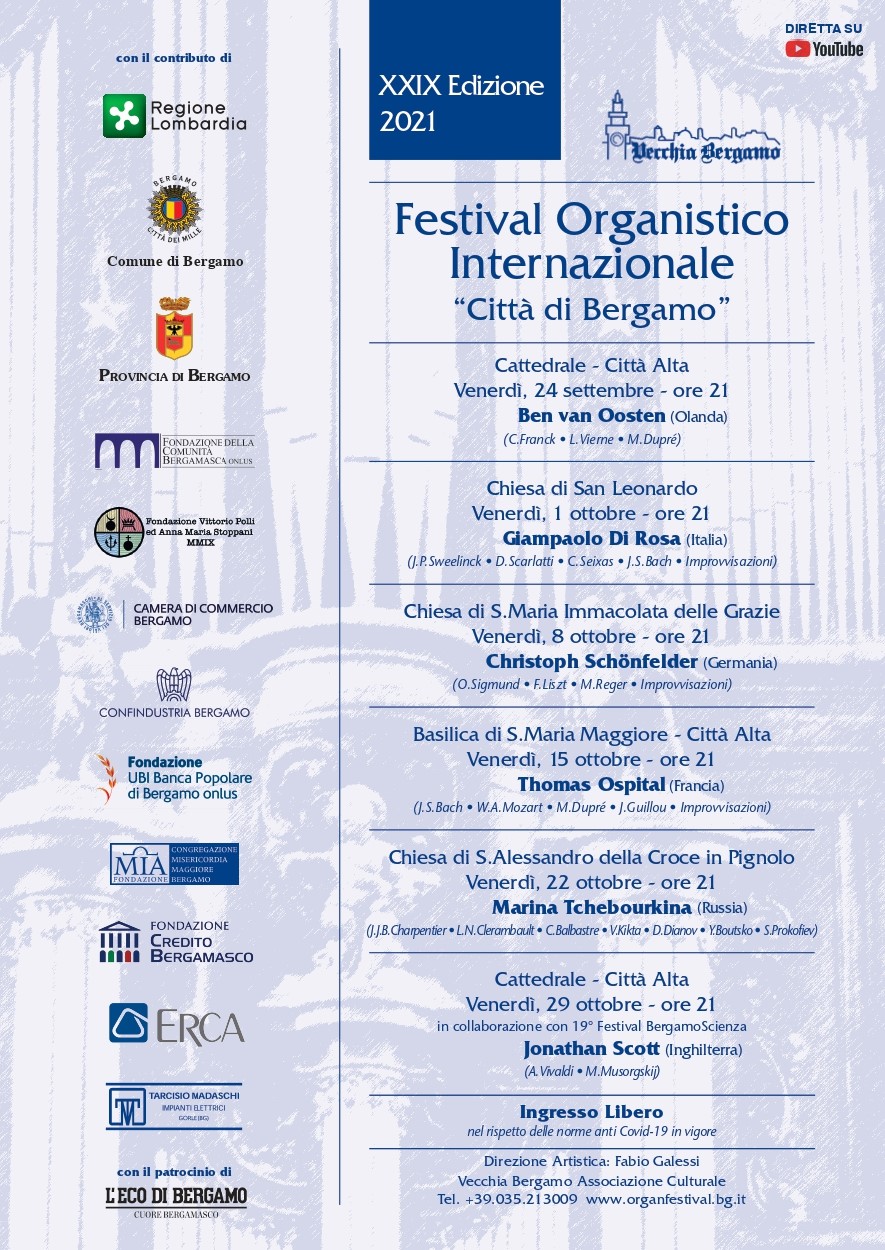 Dopo la travolgente esperienza emotiva dello scorso anno – con concerti in presenza parziale e la novità del live streaming sui social, in un clima psicologico molto complicato per la nostra città e tra mille difficoltà organizzative – il Festival Organistico Internazionale “Città di Bergamo” lancia una nuova ricchissima edizione per invitare tutti a una festa di vera rinascita nel nome di una Luce faticosamente riconquistata.
