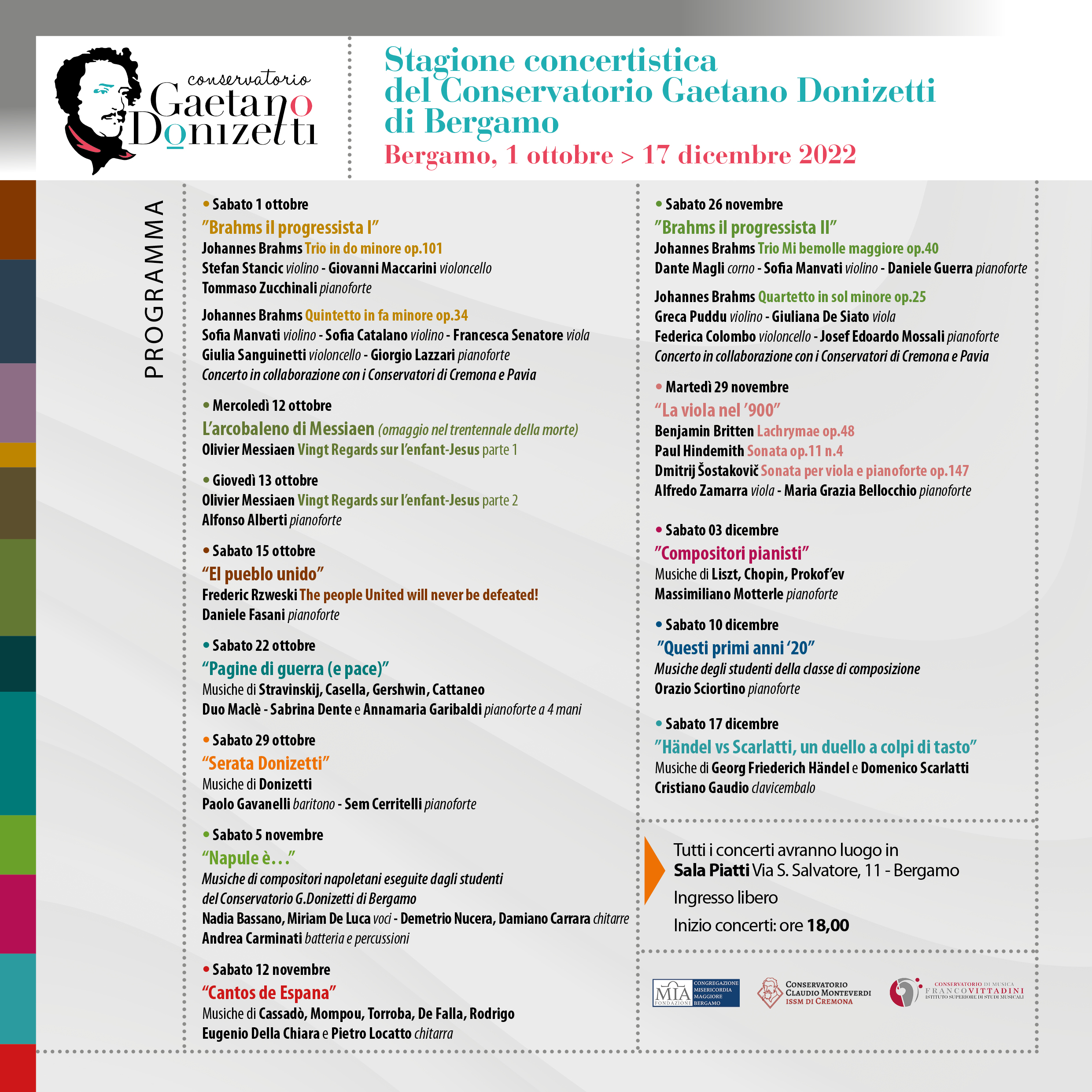 Questo sabato verranno eseguite due opere di Brahms: Trio Mi bemolle maggiore op.40 con Dante Magli al corno, Sofia Manvati al violino e Daniele Guerra al pianoforte; Quartetto in sol minore op.25 con Greca Puddu al Violino, Giuliana De Siato alla viola, Federica Colombo al violoncello e Josef Edoardo Mossali al pianoforte.
