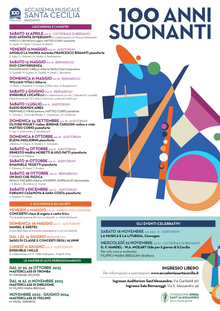 100 anni suonanti propone un ricco calendario di eventi musicali che celebrano l'Accademia Musicale Santa Cecilia, a 100 anni dalla sua fondazione da parte di Mons. Angelo Crivelli e dell'editore Vittorio Carrara. Gli appuntamenti si articolano tra i mesi di aprile e dicembre. L’organizzazione della stagione è l’evidente espressione della dimensione didattica ed artistica della nostra prestigiosa Accademia; le proposte sono infatti suddivise in tre tipologie: i maestri e l’Accademia, gli allievi e l’Accademia e gli eventi celebrativi del centenario.