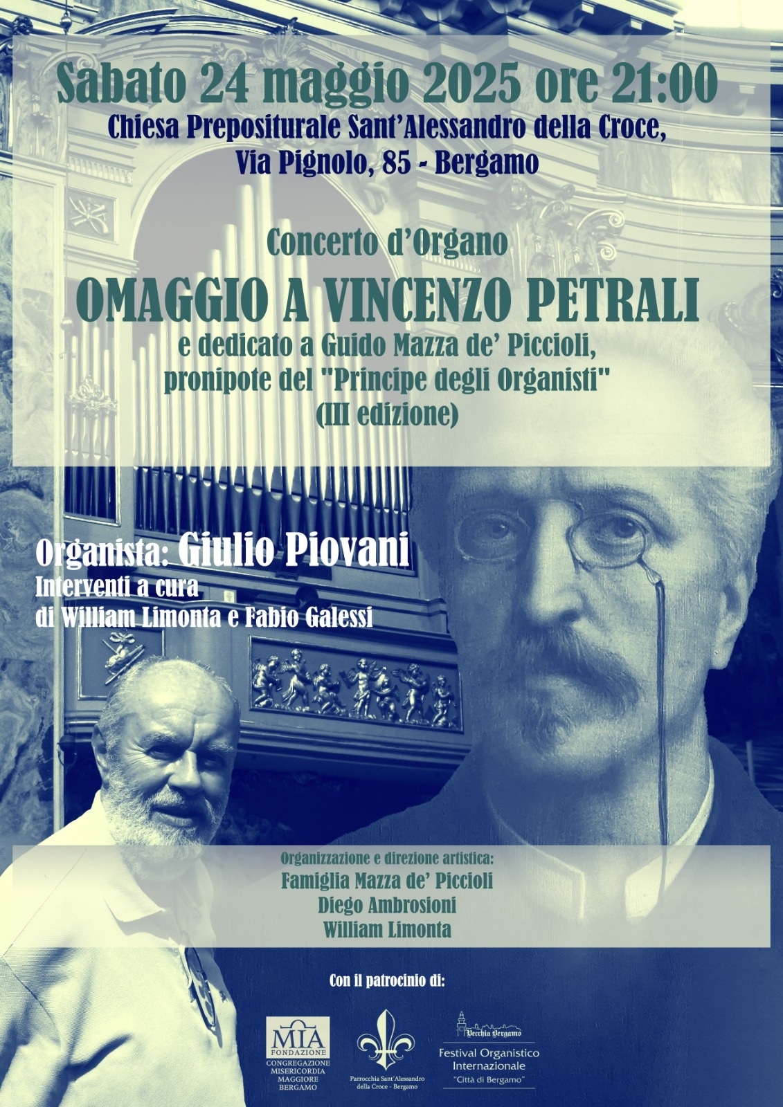 Il concerto, giunto alla terza edizione e che si terrร sabato 24 maggio, alle ore 21.00, presso la Chiesa Prepositurale di SantโAlessandro della Croce in Bergamo, intende proporre un segmento del repertorio giovanile per organo di Petrali, le cui composizioni saranno eseguite da Giulio Piovani, titolare della cattedra di Organo principale presso il conservatorio โL. Canepaโ di Sassari ed organista titolare della chiesa evangelica valdese di Milano, autore dellโincisione dellโopera per organo di Petrali per lโetichetta Tactus in 6 CD + DVD.
