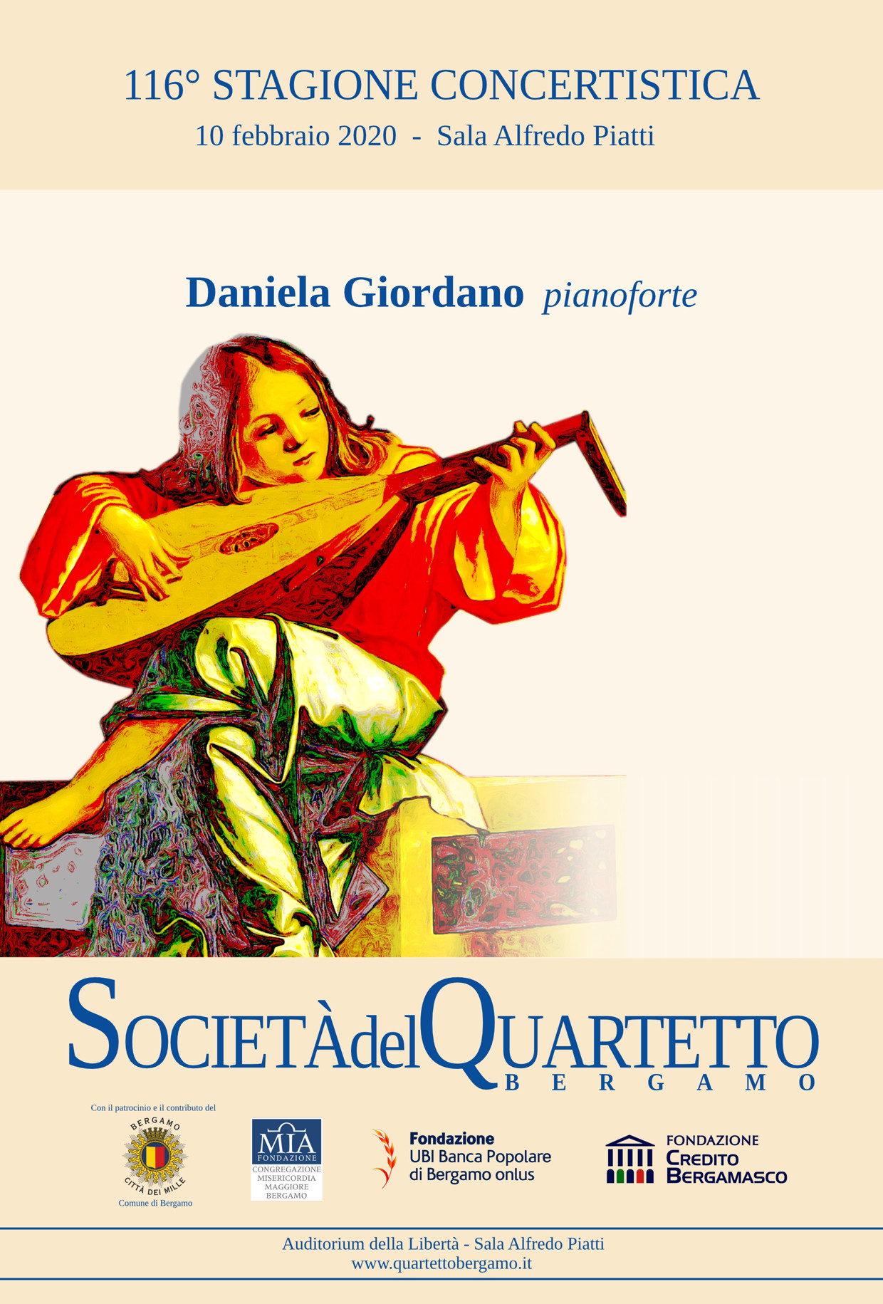 La pianista Daniela Giordano, docente del Conservatorio Gaetano Donizetti di Bergamo si esibirà in concerto con musiche di Umberto Giordano, Schumann, Chopin, Brahms, Ginastera.