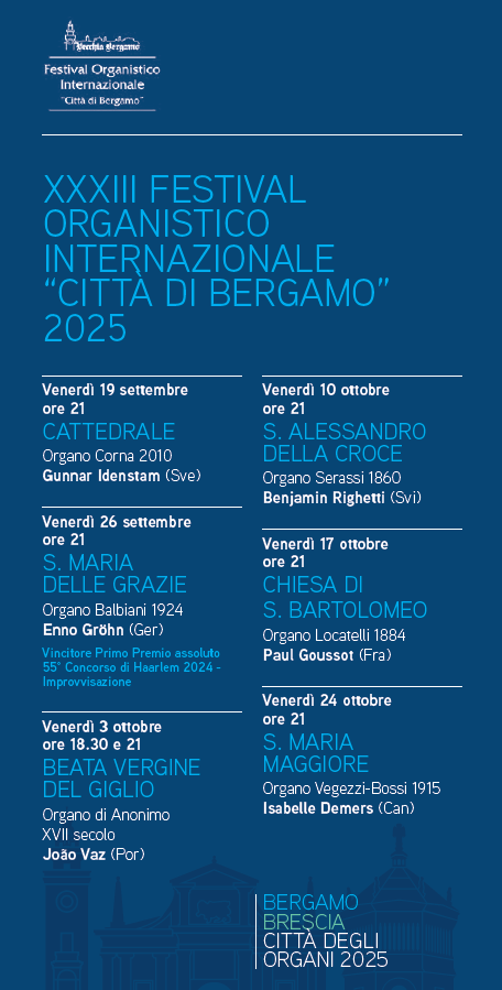 Prosegue la 33esima edizione del «Festival Organistico Internazionale "Città di Bergamo"». Ospite dalla Germania con Enno Gröhn.