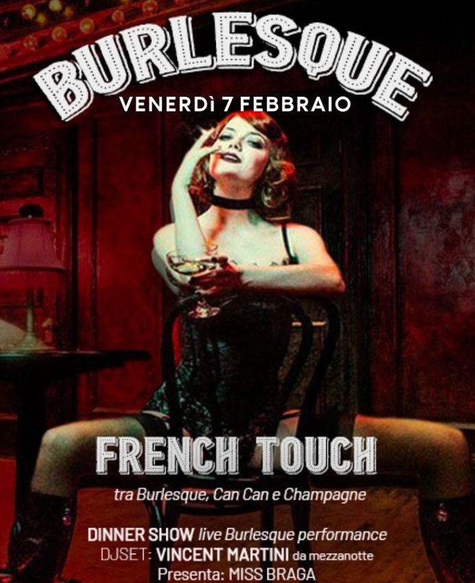 Torna a grande richiesta la serata più iconica all'insegna del french touch con menù francese e con l'atmosfera del Burlesque per un dinner show pazzesco con il nostro team di performer, presentato da Miss Braga e seguito da un djset curato dal dj resident Vincent Martini.