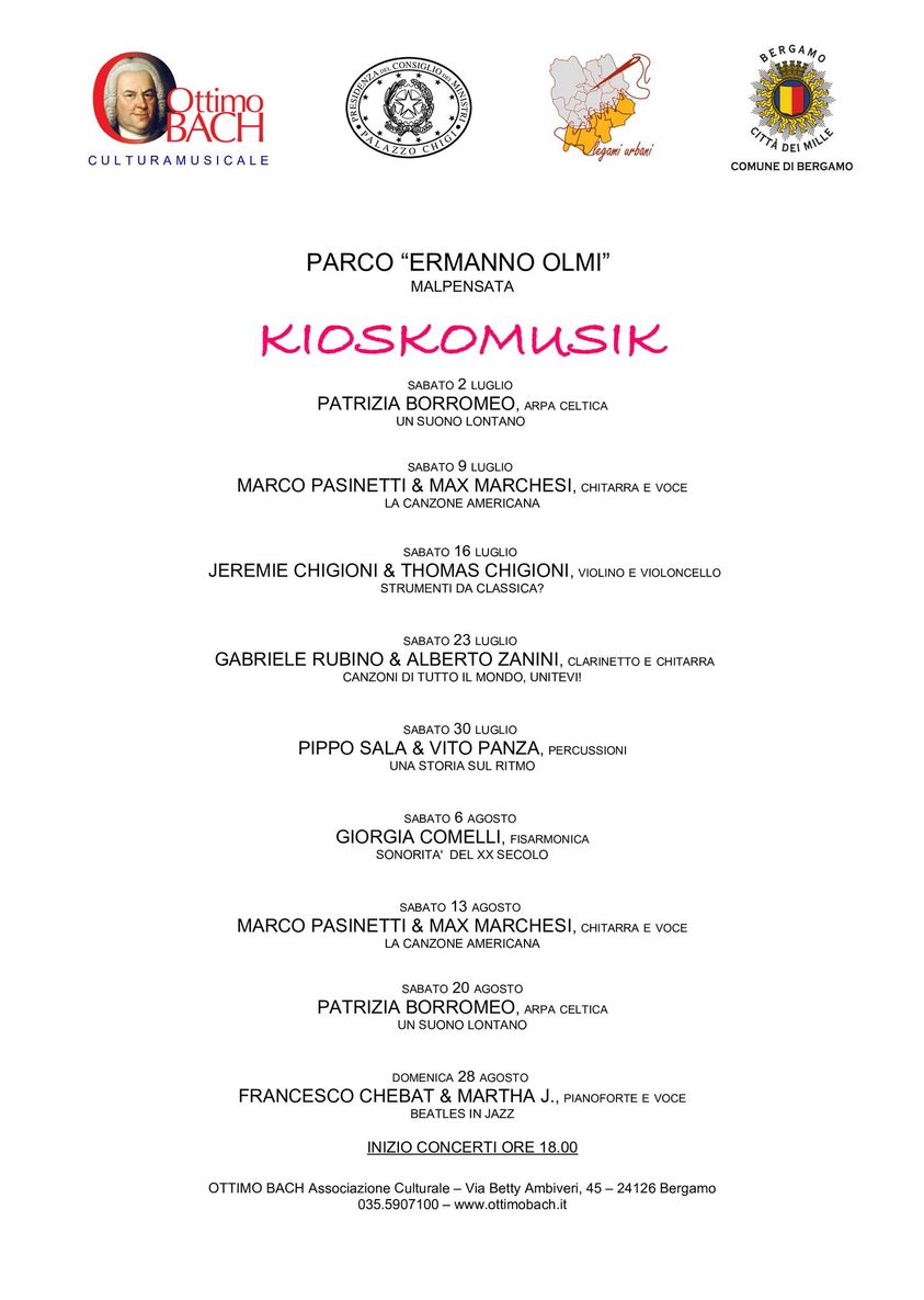 Un formula, quella di Kioskomusic, che si sviluppa sul modello della musica dal vivo proposta a inizio Novecento nei parchi pubblici europei ed è già sperimentata anche a Bergamo: l’iniziativa si affianca alle numerose rassegne programmate nel parco comunale Ermanno Olmi, nel quartiere Malpensata, rivolte soprattutto a consolidare la ritrovata fruizione pubblica di questo importante spazio cittadino, a partire dalle famiglie e dalle fasce dell’infanzia, ma non solo.