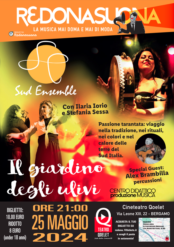 Il cineteatro Qoelet e Sud Ensemble presentano "Il giardino degli ulivi". Nella serata ospiti Ilaria Iorio e Stefania Sessa che presentano la passione tarantata: un viaggio nella tradizione, nei rituali, nei colori e nel calore delle terre del Sud Italia. Special Guest Alex Brembilla alle percussioni.