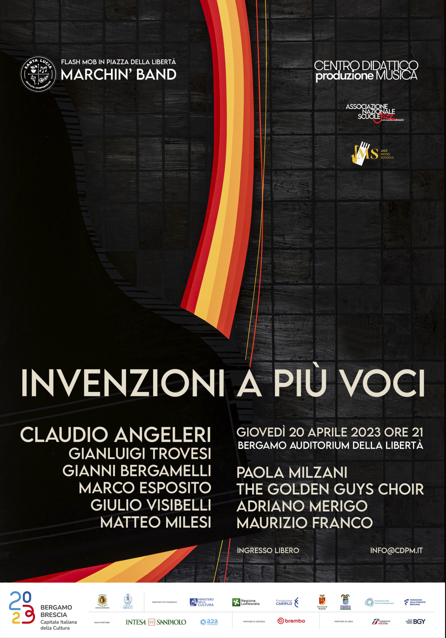 L’idea dello spettacolo multidisciplinare ruota intorno alle figure di otto personaggi storici delle due città in campo artistico, scientifico, letterario e sociale rilette attraverso la penna musicale di Claudio Angeleri e le immagini di Gianni Bergamelli animate in tempo reale dal video maker Adriano Merigo. Gaetano Donizetti, Costantino Beltrami, Giacomo Quarenghi, Caravaggio, Torquato Tasso, Niccolò Tartaglia, Arturo Benedetti Michelangeli e le donne della resistenza sono i protagonisti di otto quadri musicali e figurativi 20 aprile alle ore 21 (ingresso libero). Sul palco 32 musicisti di Bergamo e Brescia che affiancheranno il pianista e compositore Claudio Angeleri, tra cui Gianluigi Trovesi, Giulio Visibelli, il coro gospel The Golden Guys choir diretto da Paola Milzani in uno spettacolo multidisciplinare in cui la musica di improvvisazione dialoga con le immagini in movimento di Gianni Bergamelli e i testi di Maurizio Franco. In apertura la marchin band di 70 studenti dell’Istituto Santa Lucia accompagnerà il pubblico da Piazza della Libertà al palcoscenico dell’auditorium. Si tratta di un laboratorio sulla percussione di strada messo a punto in questi mesi da Lorenzo Roncelli con i docenti delle scuole primarie Diaz e Rodari dell’IC Santa Lucia di Bergamo.