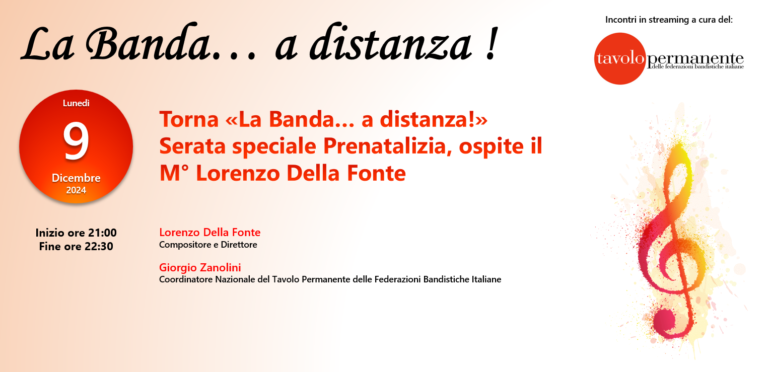 Anche quest'anno torna, con un evento prenatalizio "La Banda... a distanza!", iniziativa giunta alla sesta edizione. Anche questa volta abbiamo un'ospite di eccezione, il M° Lorenzo Della Fonte, direttore, compositore e docente del Conservatorio di Torino.