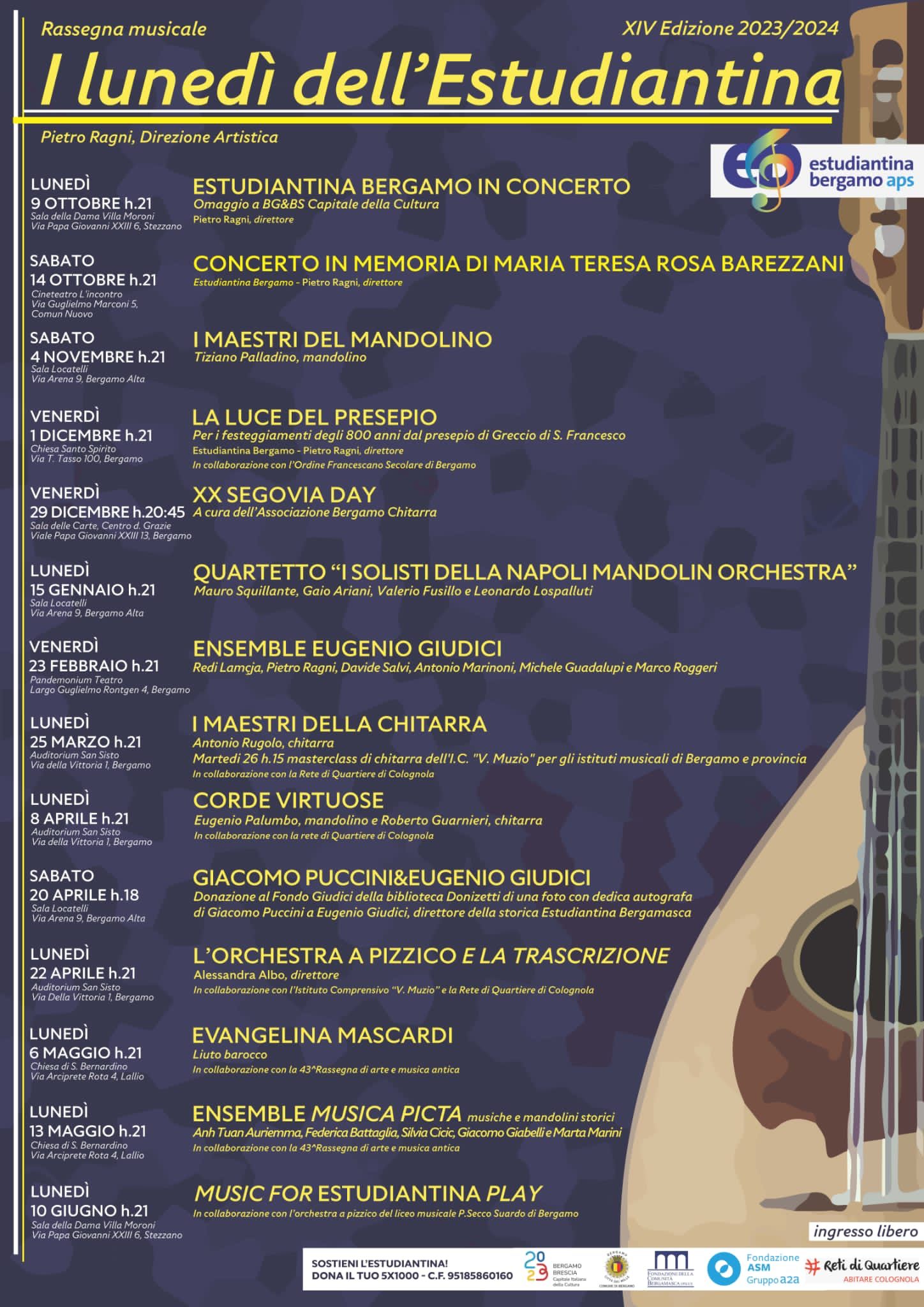 Ritorna l'annuale concerto di Natale dell'Estudiantina Bergamo. In collaborazione con l'Ordine Francescano Secolare di Bergamo, si festeggeranno gli 800 anni del presepio di Greccio di S. Francesco. Melodie natalizie con l'anteprima mondiale di un brano del maestro Salvatore Della Vecchia composto per l'orchestra Estudiantina ed ispirato alla colonna sonora del film "Fratello sole, sorella luna" (1972 - Regia di Franco Zeffirelli - Musiche di Ortolani-Donovan).