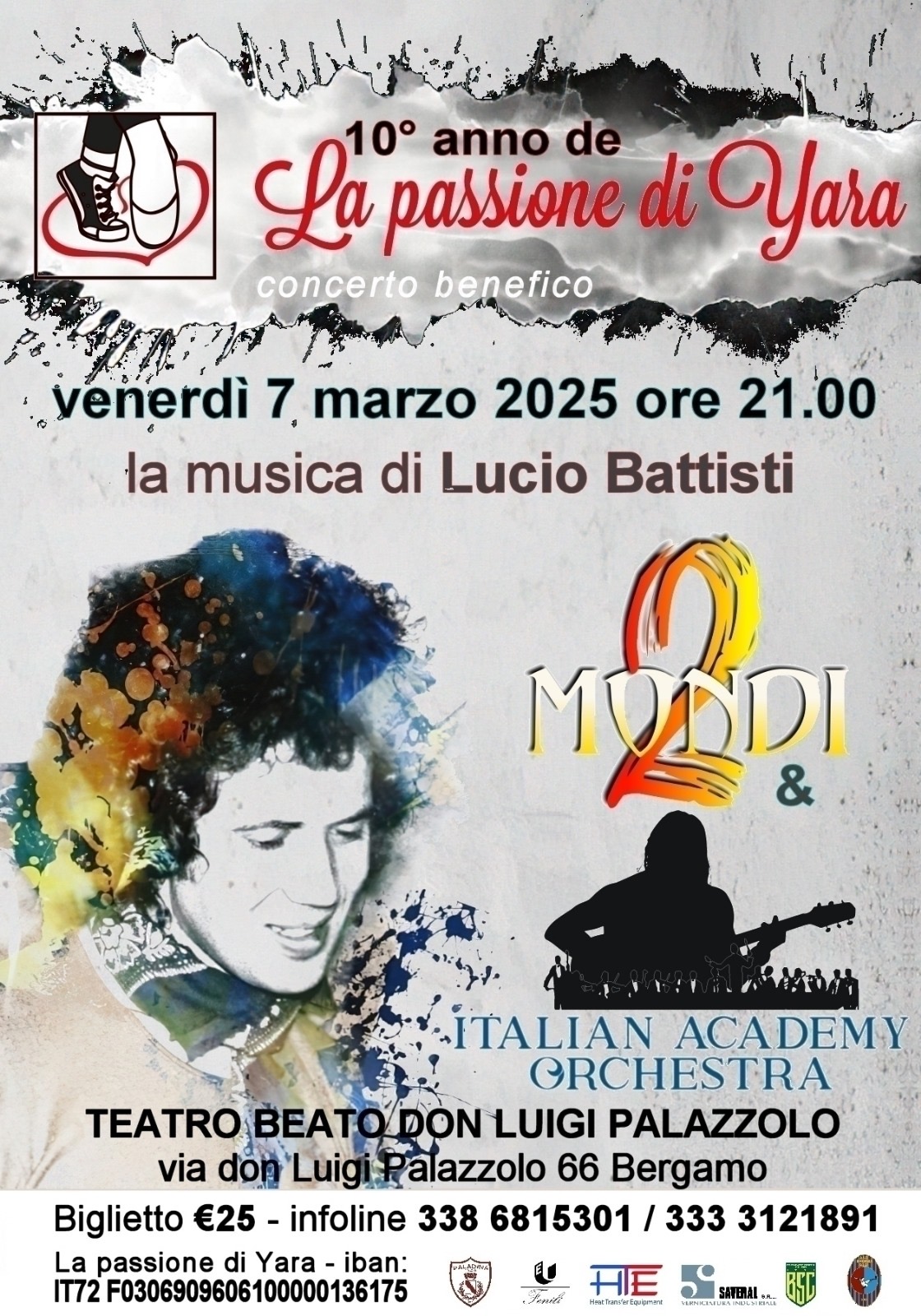 In occasione del decimo anno de La Passione di Yara, l'associazione organizza un concerto benefico che omaggia il grande Lucio Battisti: la magia della musica del cantautore italiano con 2 Mondi e la Italian Academy Orchestra.