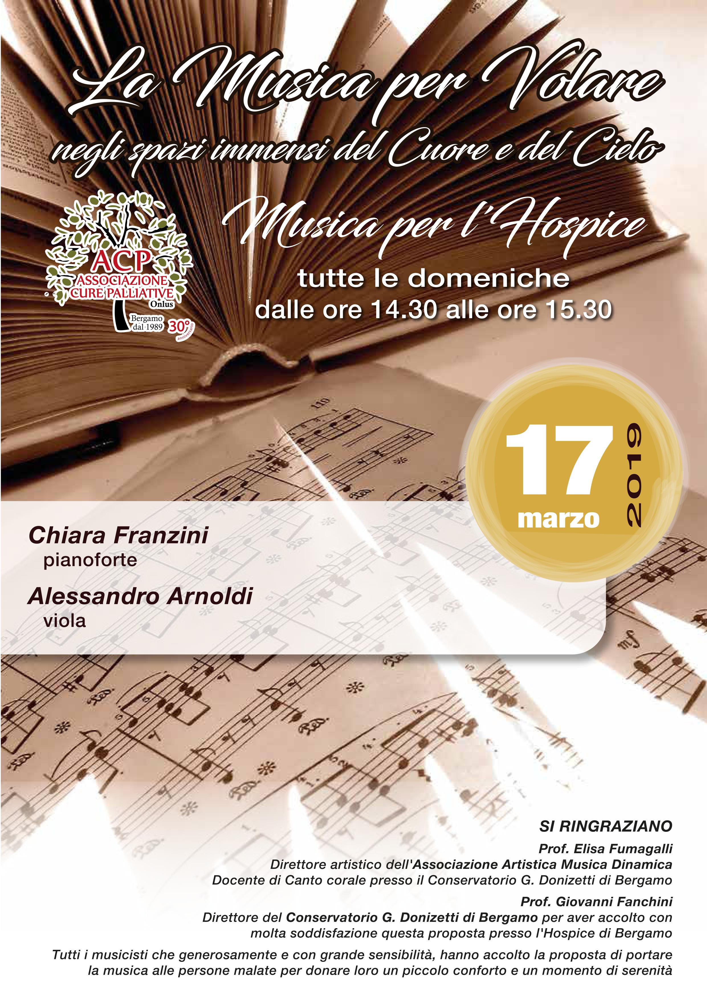 L'Associazione Cure Palliative Onlus vi invita a «Musiche per l'Hospice», l'evento musicale che si tiene tutte le domeniche da marzo a maggio presso l'Hospice di Borgo Palazzo con la partecipazione del conservatorio di Bergamo, per poter regalare momenti di leggerezza a coloro che vivono momenti di fragilità.