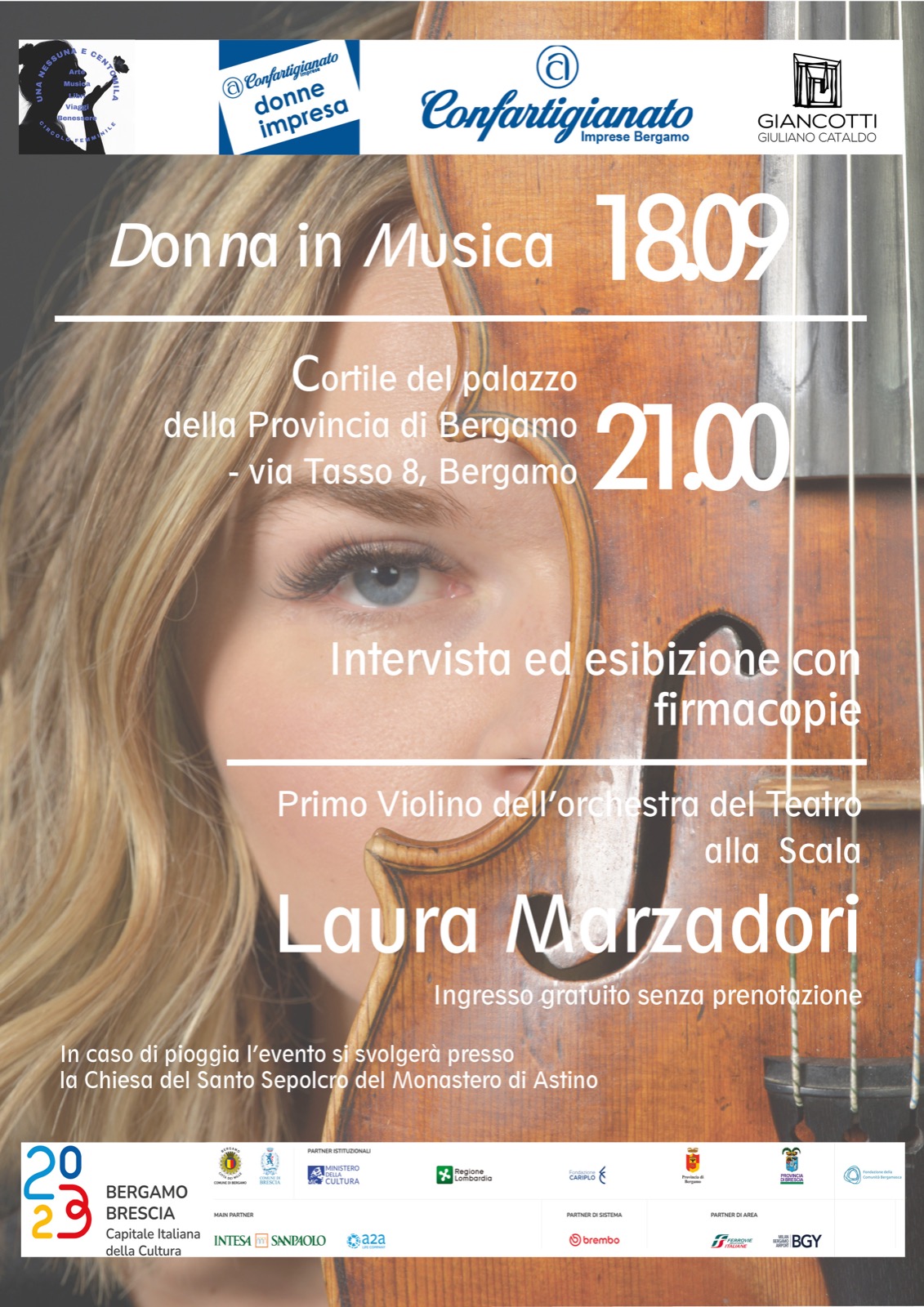 La Rassegna โDonne in musicaโ nasce allโinterno del piรน ampio progetto โEu-noรจโ, volto alla valorizzazione di giovani artisti italiani, presenta Laura Marzadori, primo violino Teatro alla Scala.