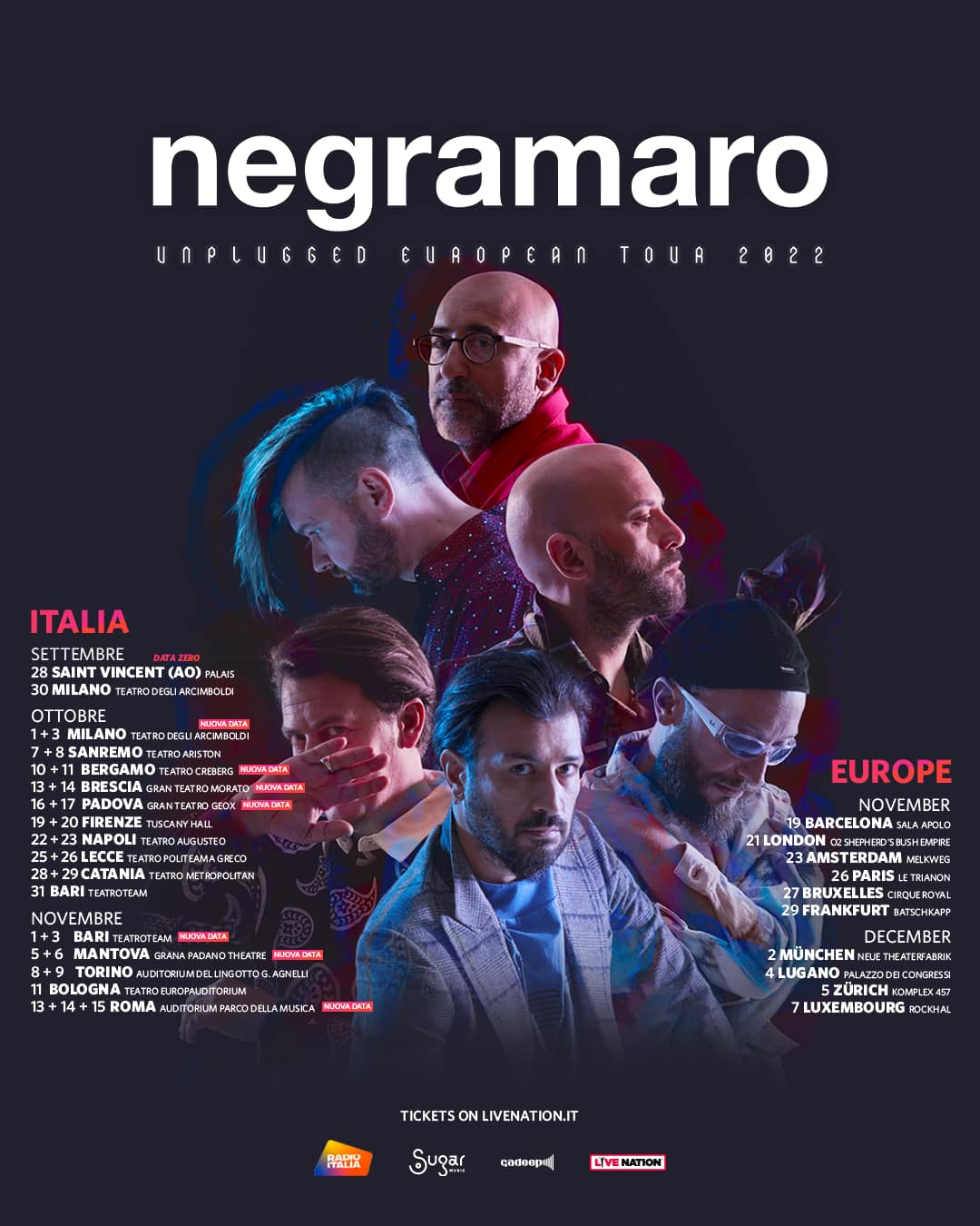Dopo oltre 15 anni di concerti nelle grandi venue, dai palazzetti ai Festival e agli stadi, continua il successo che ha accompagnato sin dagli scorsi mesi l’annuncio del nuovo tour del gruppo, già tutto esaurito in diversi teatri italiani. Il ritorno sul palco dei Negramaro si preannuncia un’occasione imperdibile per ascoltare e rivivere in un’atmosfera più intima la musica che ha decretato il successo internazionale della band.