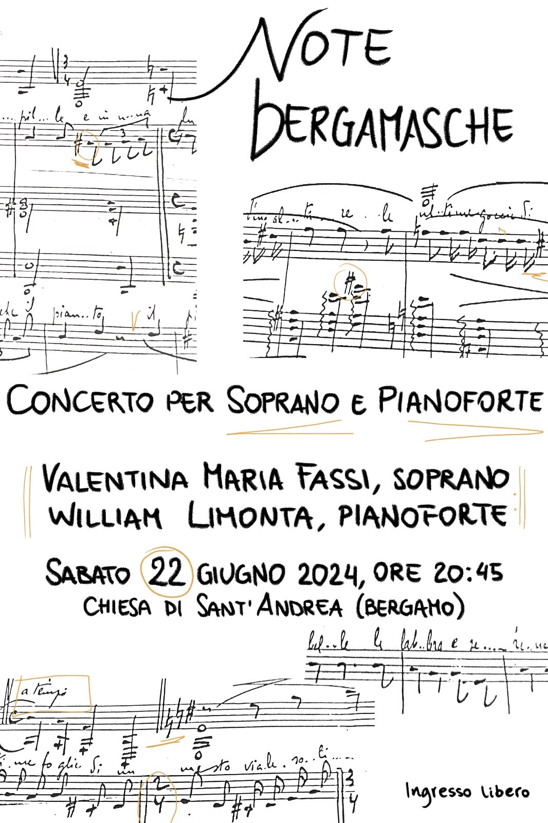 Sabato 22 giugno, ore 20:45, presso la Chiesa di Sant'Andrea a Bergamo, si terrà un interessante concerto, che vedrà partecipe in qualità di pianista il compositore e musicologo William Limonta insieme alla giovane soprano Valentina Maria Fassi, studente del Politecnico delle Arti - Conservatorio "Gaetano Donizetti" di Bergamo.