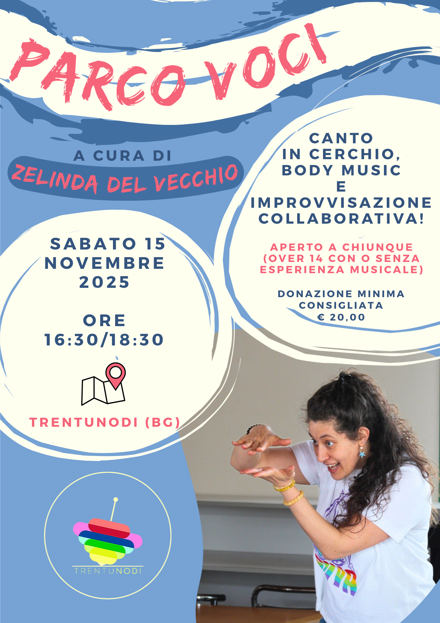 Uno spazio per esplorare la musicalità in modo spontaneo e vivace: un laboratorio rivolto ad adolescenti e adulti a cura di Zelinda del Vecchio, cantante, insegnante di canto, educatrice musicale, formatrice e facilitatrice di avventure sonore rotonde.