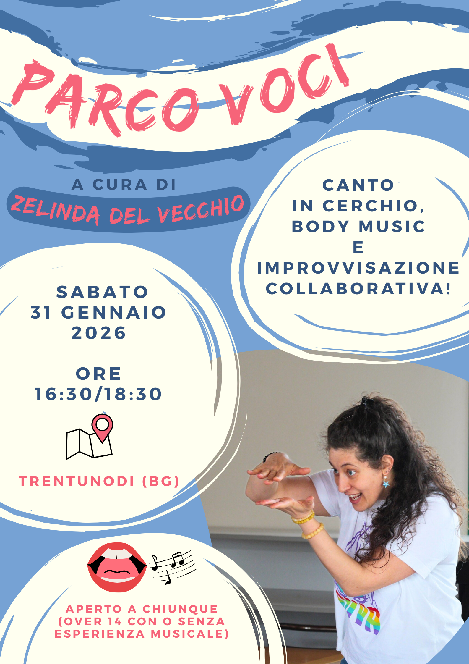 Un laboratorio rivolto ad adolescenti e adulti a cura di Zelinda Del Vecchio, cantante, insegnante di canto, educatrice musicale, formatrice e facilitatrice di avventure sonore rotonde!