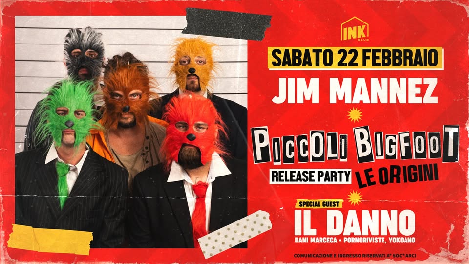 Piccoli Bigfoot: è una folk punk band mutante. Presentano il loro secondo album "Le Origini" con un super live, alternando momenti di profondità a travolgente voglia di fare festa!