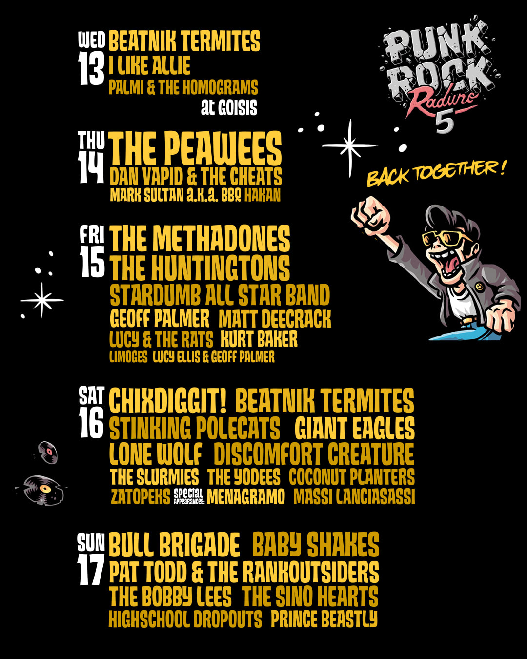 Sabato 16 luglio. Edoné: dalle 16 alle 16.30 The Slurmies; dalle 16.45 alle 17.15 Coconut Planters; dalle 17.30 alle 18 The Yodees; dalle 18.15 alle 18.45 Discomfort Creature; dalle 19 alle 19.45 Lone Wolf; dalle 20 alle 20.45 Stinking Polecats; dalle 21 alle 21.45 Giant Eagles; dalle 22 alle 22.45 Beatnik Termites; dalle 23 a mezzanotte Chixdiggit. Bombonera Social Pub: dalle 12 alle 12.30 e dalle 13 alle 13.20 gli Zatopeks. Sempre sabato tour con il «Punk Rock Bus» con dj set di Ciaccio Semprefreski: alle 10 Edoné, alle 10.30 Bergamo Hostel, alle 11 Propilei, alle 11.10 Stazione di Bergamo, alle 11.20 Bikefellas, alle 11.50 Bombonera Social Pub, alle 15 ritorno all’Edoné. All’Ink Club after party dall’una di notte alle 5 del mattino con dj set di Mass Manges, bassista dei Manges, storica band punk rock di La Spezia.