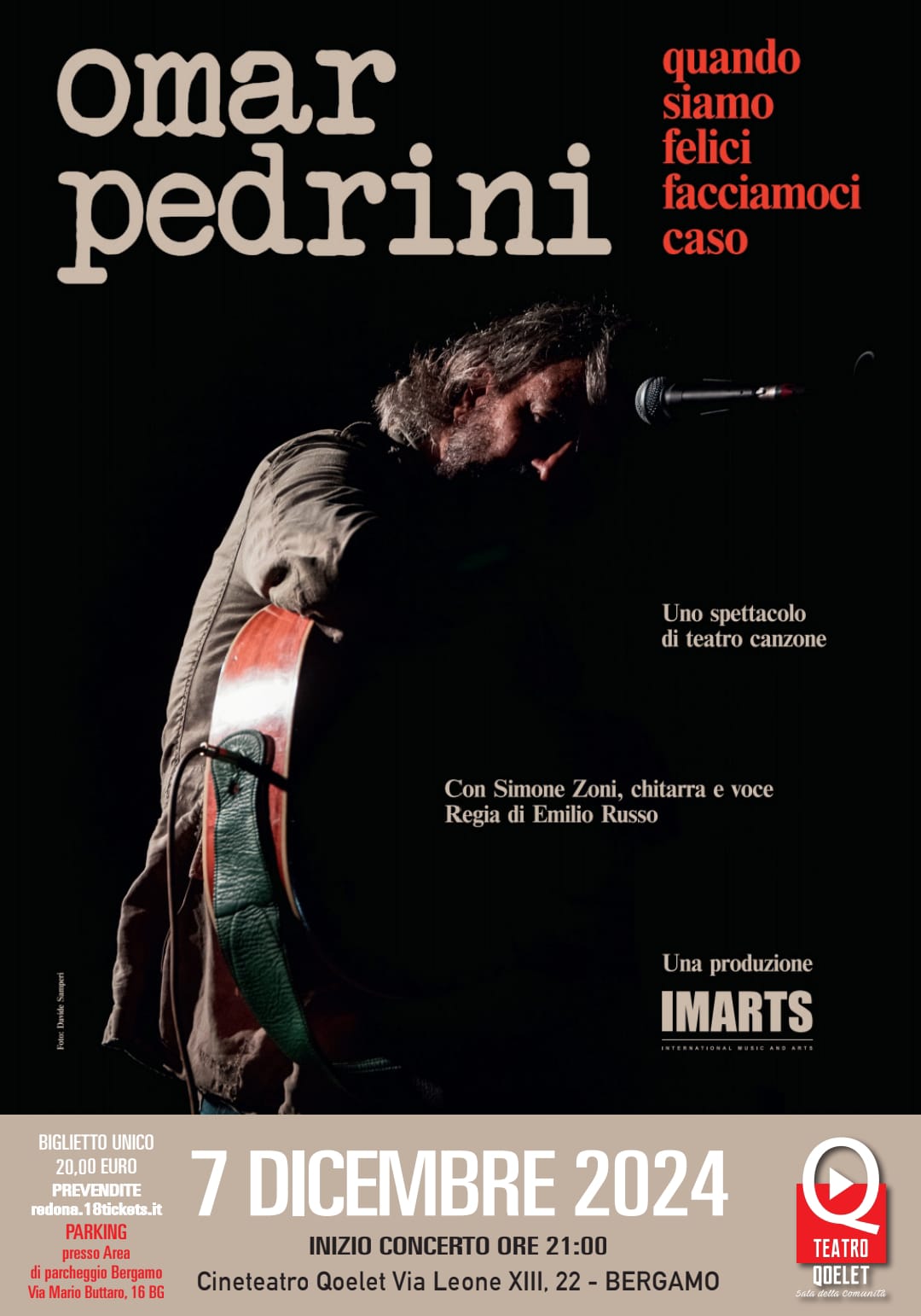 Con Omar Pedrini nel doppio ruolo di narratore e musicista, Emilio Russo alla regia e Simone Zoni alla chitarra, "Quando siamo felici facciamoci caso" è un’esperienza sincera e autentica, in cui i brani del cantautore bresciano si intrecciano con quelli di altri autori affini, echi di poesia, arte e riflessioni profonde, tracciando un inno a una vita più umana e consapevole.