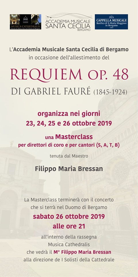 Il concerto è anche l’occasione per allievi direttori d’orchestra e cantori di potersi perfezionare in questo raffinato repertorio sotto la guida di un direttore e didatta di fama internazionale, che assieme ai solisti della Cappella terrà nei giorni antecedenti una masterclass di studio e approfondimento del capolavoro di Fauré organizzata dall’Accademia Musicale Santa Cecilia di Bergamo.