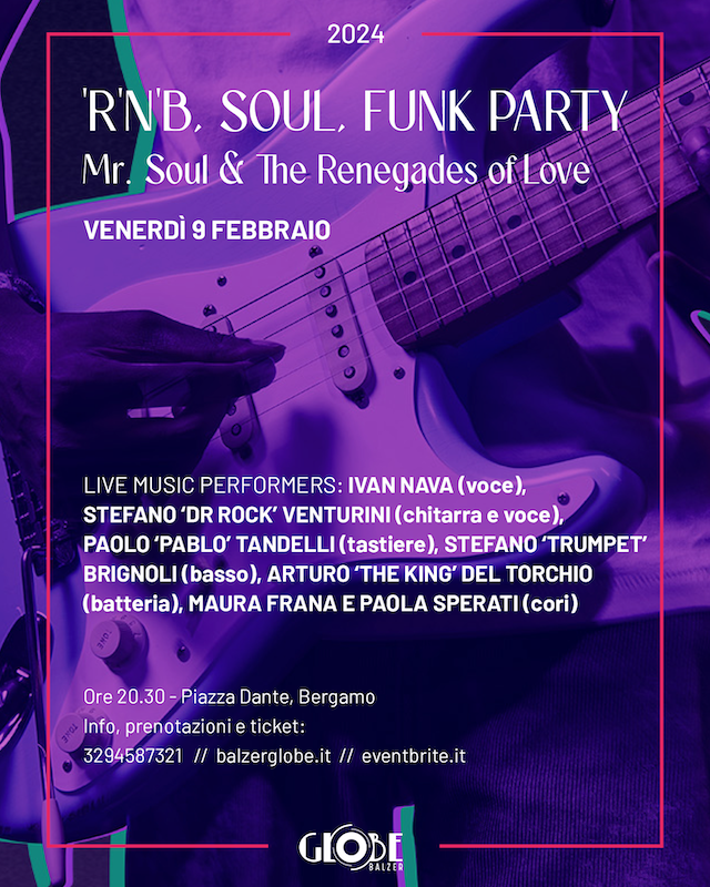 Il Globe Balzer presenta una serata con musica R&B, soul e funk che accompagnerà la cena e farà venire voglia di alzarsi dalla sedia e ballare! Si esibiranno Mr. Soul & The Renegades of Love