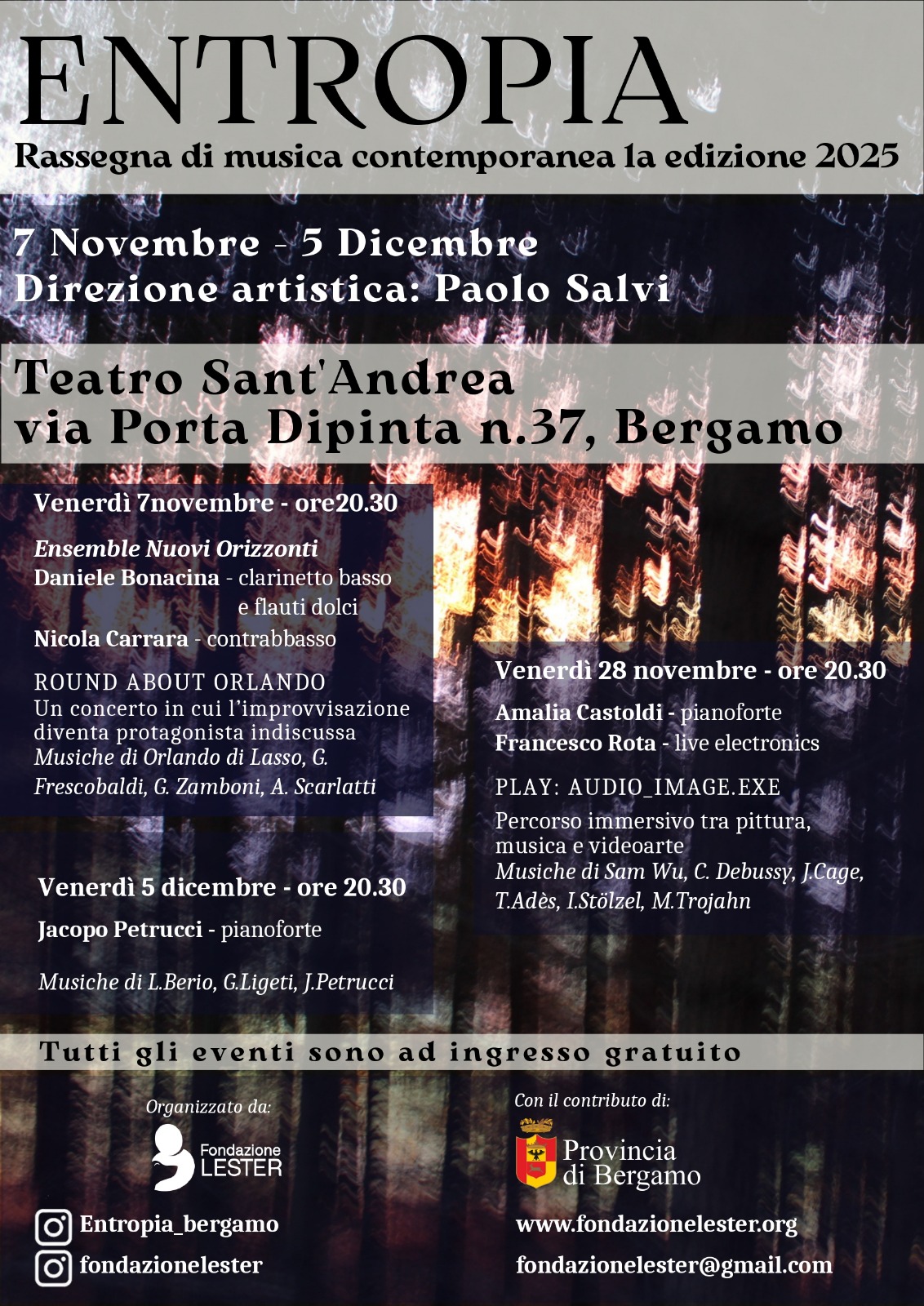 Dal 7 novembre al 5 dicembre, il Teatro Sant’Andrea di Bergamo ospita «Entropia», rassegna di musica contemporanea diretta da Paolo Salvi e promossa dalla Fondazione Lester con il contributo della Provincia di Bergamo.