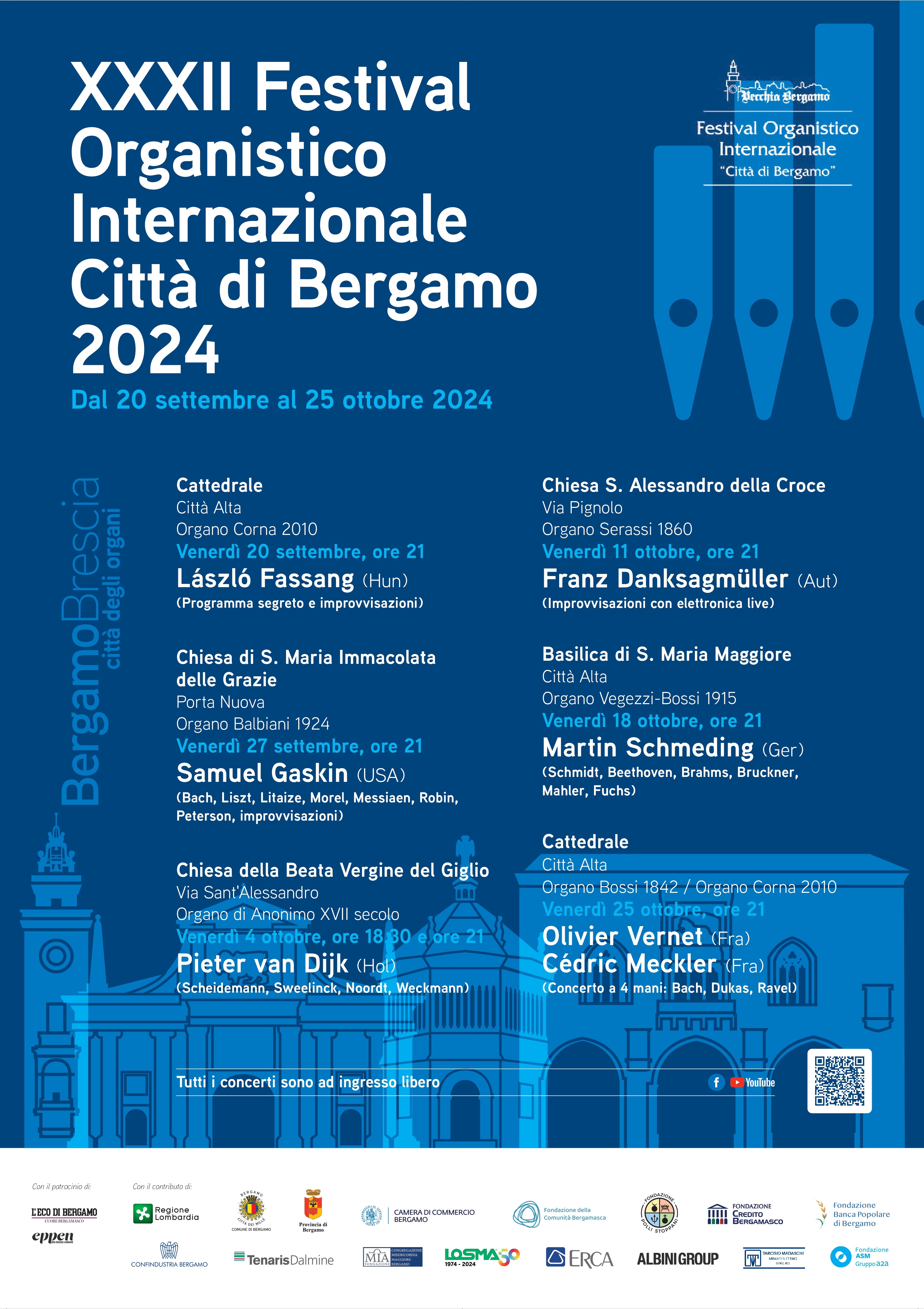 Dopo l’entusiasmante successo ottenuto dalla ricca programmazione progettata per ‘Bergamo-Brescia, Capitale Italiana della Cultura 2023’, quest’anno il Festival Organistico Internazionale “Città di Bergamo” torna alla sua veste tradizionale. Lo fa tuttavia mantenendo la sinergia con il proprio partner bresciano, l’Associazione ‘Amici della Chiesa del Carmine’, che lo scorso anno ha potuto avviare una rassegna internazionale parallela a quella bergamasca. Ciascuna manifestazione proseguirà ora con le proprie risorse economiche e la propria direzione artistica, mantenendo il sottotitolo utilizzato per la ‘Capitale’: “Bergamo-Brescia, Città degli Organi”.