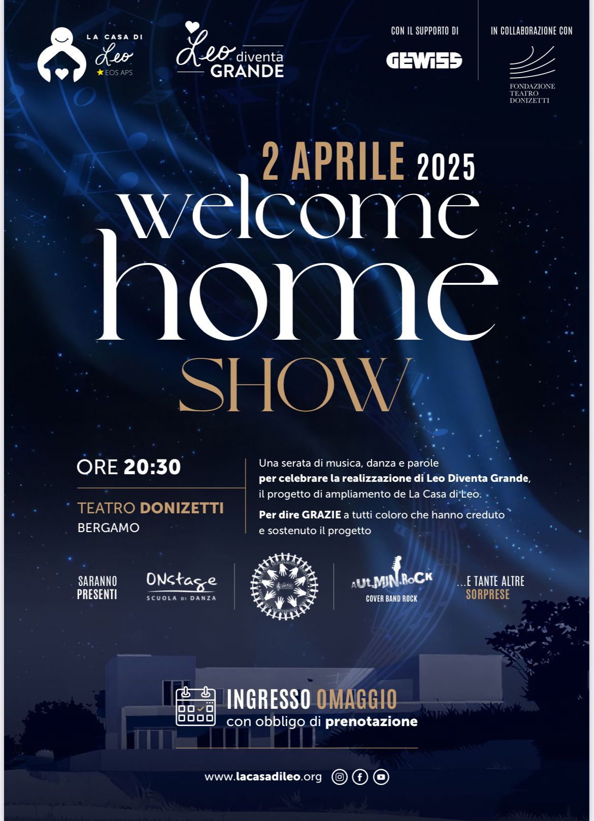 La Casa di Leo organizza "Welcome Home" Show, un evento speciale che si terrà mercoledì 2 aprile 2025, alle ore 20:30, presso il Teatro Donizetti di Bergamo. Questa serata unica, che mescola musica, danza e parole, vedrà la partecipazione di numerose realtà locali, in un evento dedicato alla celebrazione di un importante traguardo: l'ampliamento della struttura, con la realizzazione del progetto "Leo Diventa Grande", inaugurato lo scorso 22 febbraio.
