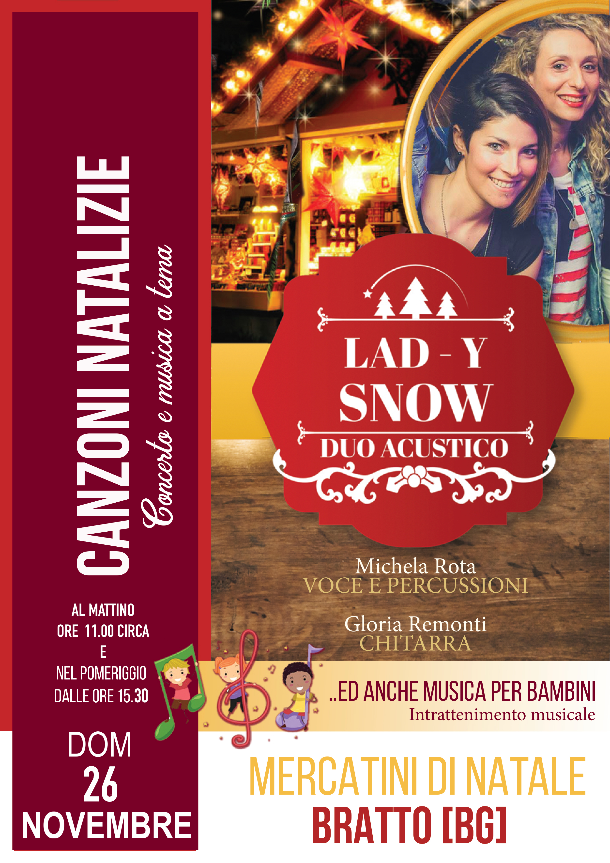 Le Lad-Y Snow, duo acustico con Michela Rota alla voce e percussioni e Gloria Remonti alla chitarra acustica, accompagneranno la giornata di Domenica 26 Novembre ai mercatini di Natale della Presolana, nella piazza di Bratto!