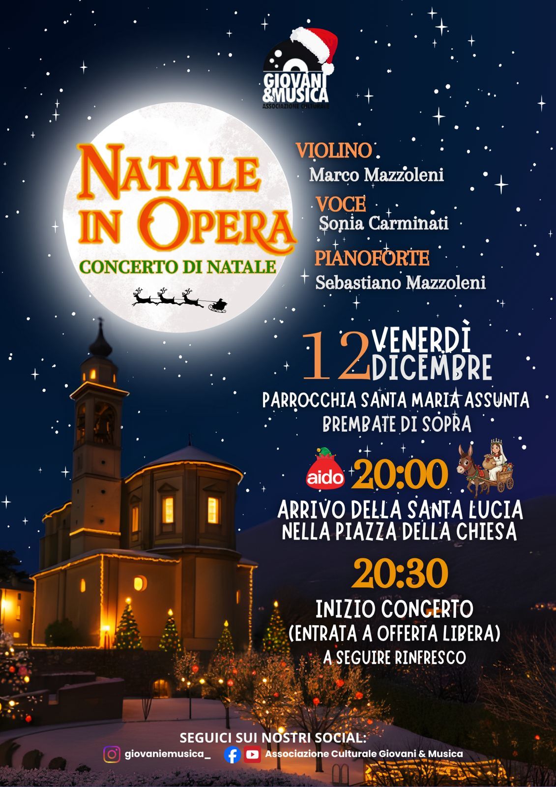 Venerdì 12 dicembre, presso la Parrocchia Santa Maria Assunta a Brembate di Sopra, l'Associazione Culturale Giovani & Musica presenta un Concerto di Natale con i talenti di Marco Mazzoleni al violino, Sonia Carminati alla voce e Sebastiano Mazzoleni al pianoforte.