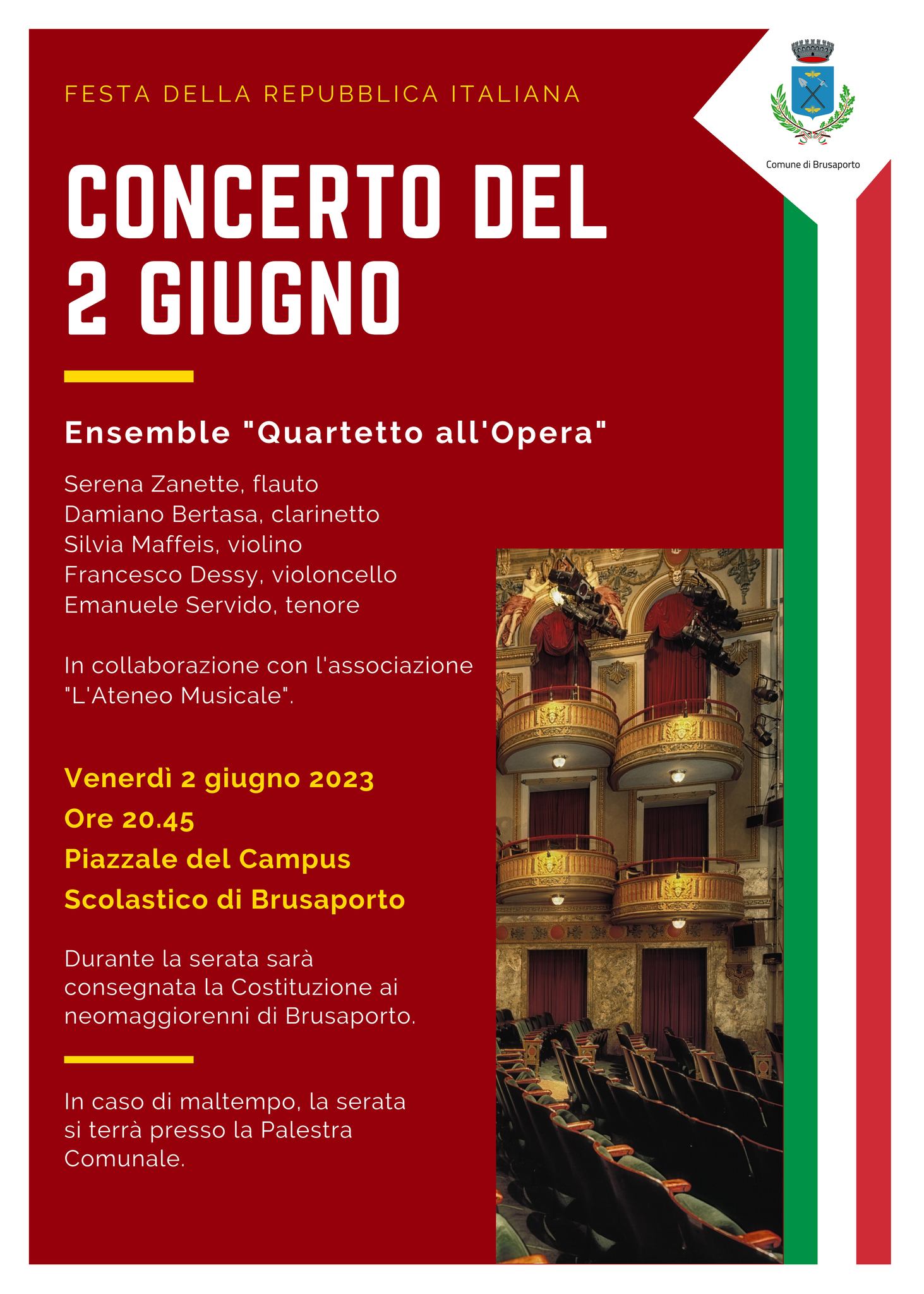 Si terrà un concerto in occasione della Festa della Repubblica Italiana. Durante la serata sarà consegnata la Costituzione ai neomaggiorenni di Brusaporto.