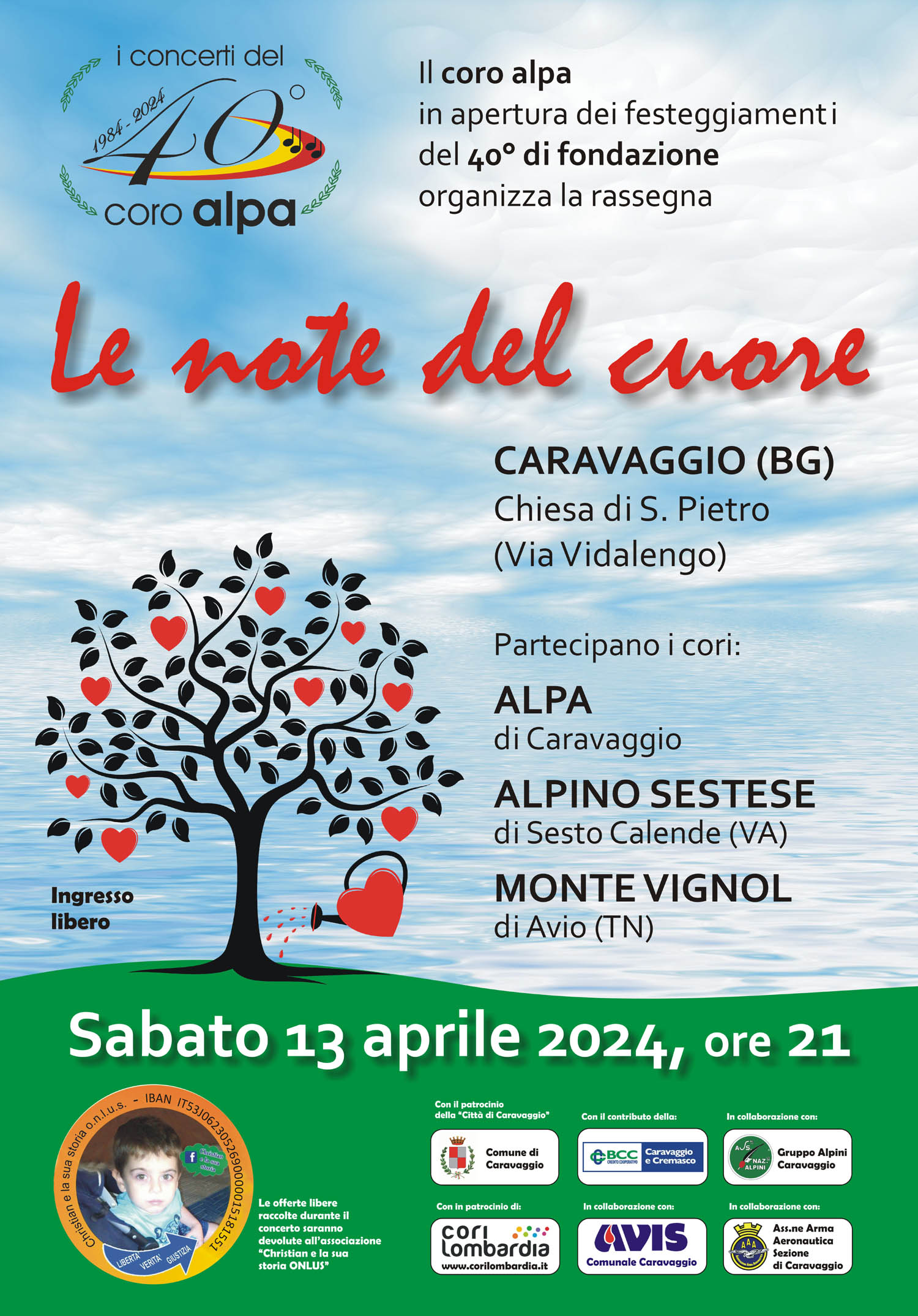 Sabato 13 Aprile alle 21, in apertura dei festeggiamenti del quarantesimo di fondazione il Coro Alpa di Caravaggio organizza la rassegna corale "Le note del cuore" alla quale parteciperanno anche i cori Alpino Sestese di Sesto Calende (VA) e Monte Vignol di Avio (TN).