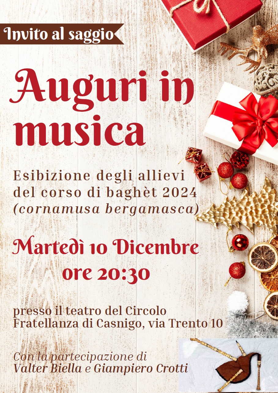 Esibizione degli allievi del corso di baghèt 2024: un saggio con brani tradizionali e musica festiva, in attesa del Natale e dell'atmosfera calda e unica delle festività invernale.