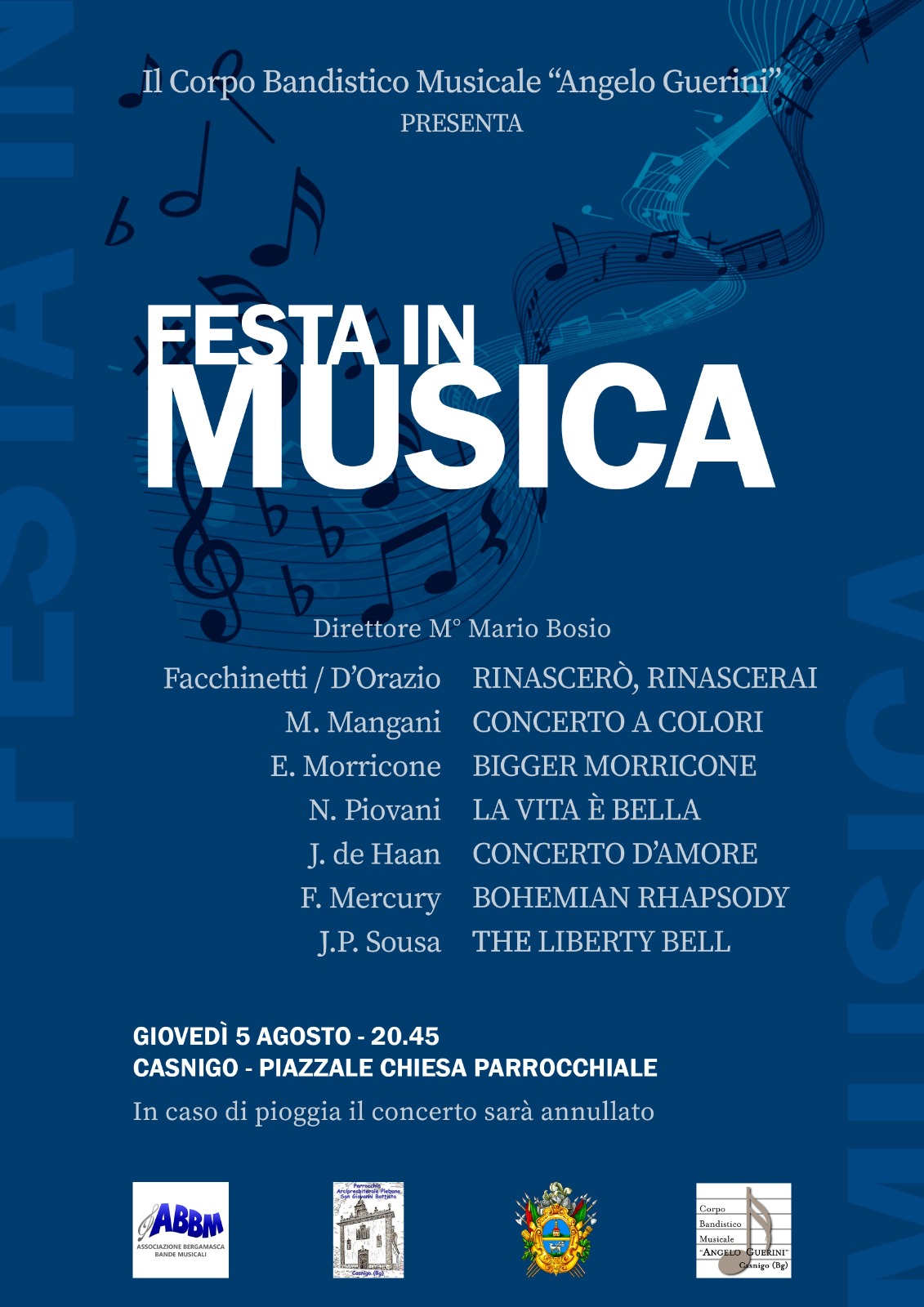 Il corpo bandistico musicale Angelo Guerini presenta Festa in Musica, giovedì 5 agosto alle 20,45, presso il piazzale della chiesa di Casnigo.
