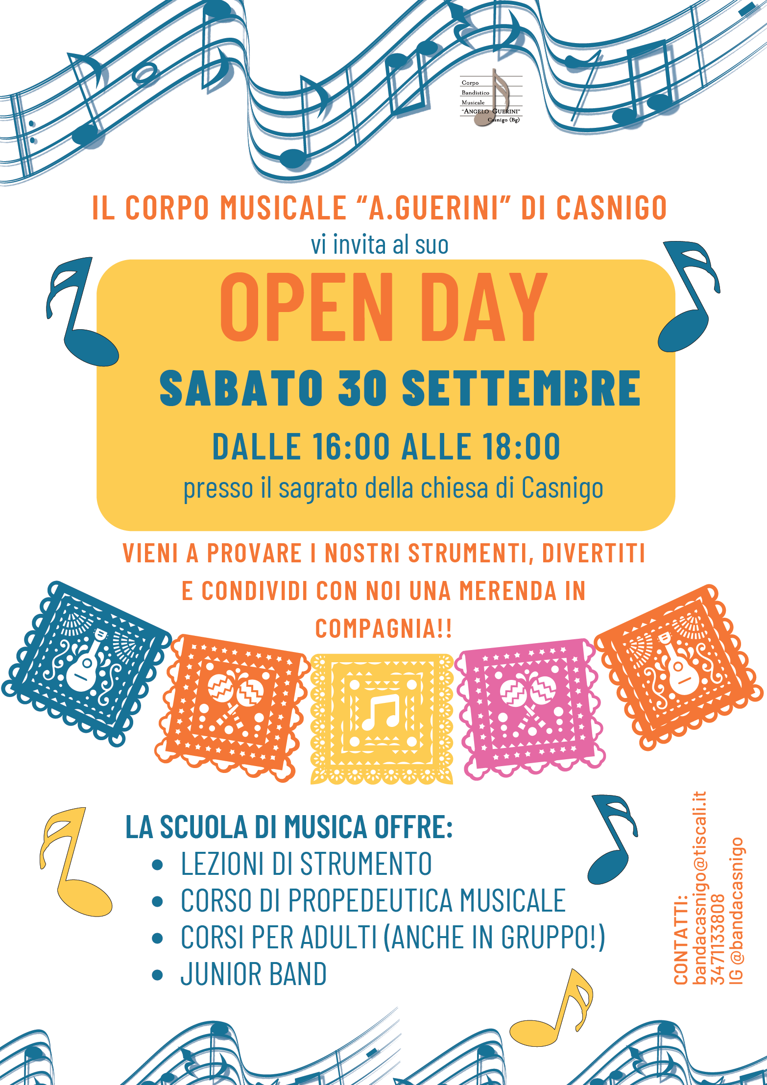 Il corpo musicale "A. Guerini" vi invita al suo Open Day sabato 30 settembre dalle 16.00 alle 18.00 presso il sagrato della Chiesa di Casnigo.