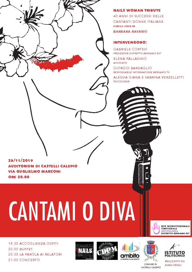 Cantami o diva del pelide Achille l’ira funesta, è il proemio dell’Iliade, dal quale è stato catturato l’incipit per dare nome a una serata che mira a contrastare l’ira, che scatena reazioni violente, incontrollate. La violenza sulle donne assume diverse sfaccettature, ragione per cui il concerto, che avrà come protagonisti i componenti del progetto Nails Woman Tribute e la splendida voce di Barbara Ravasio, verrà preceduto da un breve momento di relazione. Interverranno delle figure professionali differenti che tratteranno il tema della violenza sulle donne dal punto di vista del loro ruolo: Gabriele Cortesi, presidente del distretto Bergamo Est, l’avvocato Elena Palladino, il responsabile dell’informazione di BergamoTV Giorgio Bardaglio, le psicologhe Alessia Giana e Sabrina Verzelletti. Il concerto, tenutosi anche lo scorso anno al Palacreberg di Bergamo, ripercorre 40 anni di successi italiani con un grande rispetto negli arrangiamenti e fedeltà sonora. Il repertorio è un omaggio alle migliori cantanti del panorama femminile italiano, riproponendo brani che hanno portato al successo artiste come Giorgia, Laura Pausini, Fiorella Mannoia, Emma Marrone, Loredana Berté e tante altre.